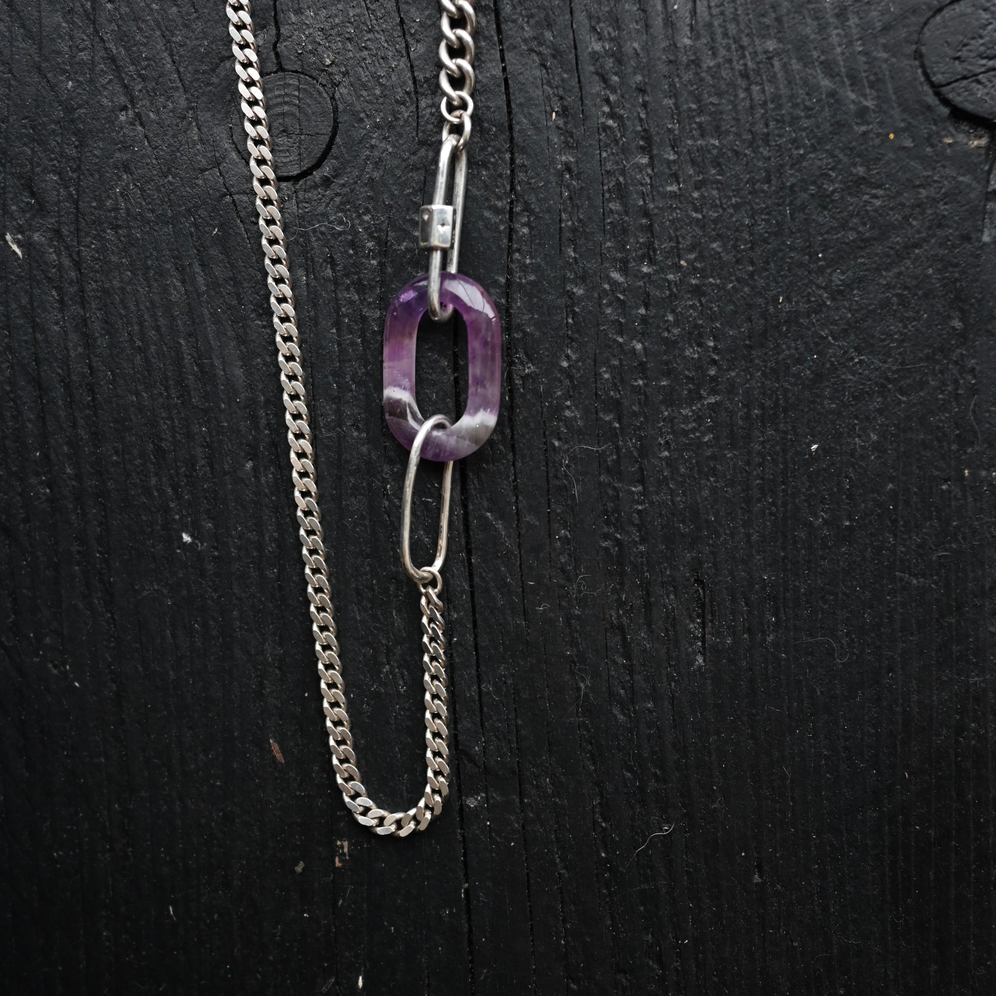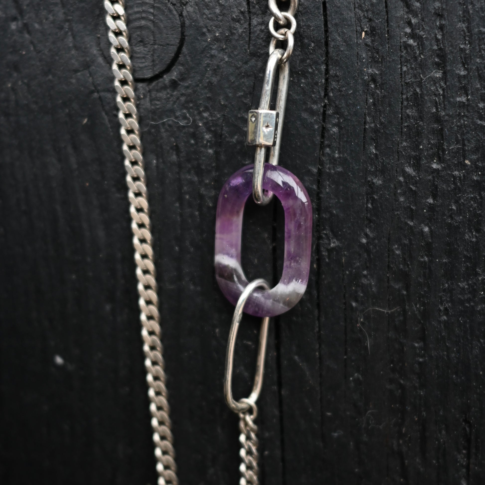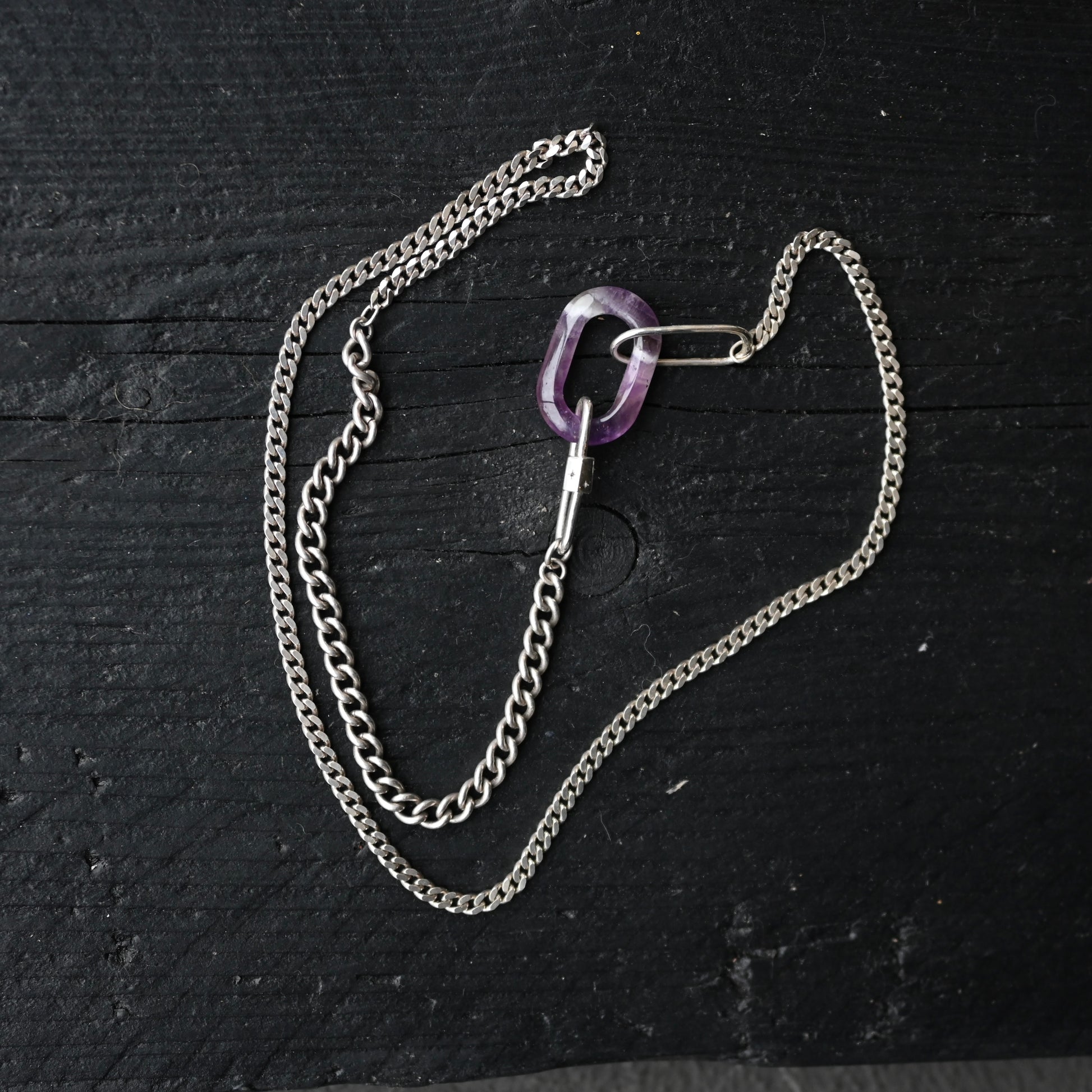 A vintage amethyst hoop on two type antique sterling silver chain with a star-studded silver shackle. Great as a standalone chain or to pair with your own talismans and crystals. You know my well documented feelings on mix n matching and for you to customise your own things. Do it!!