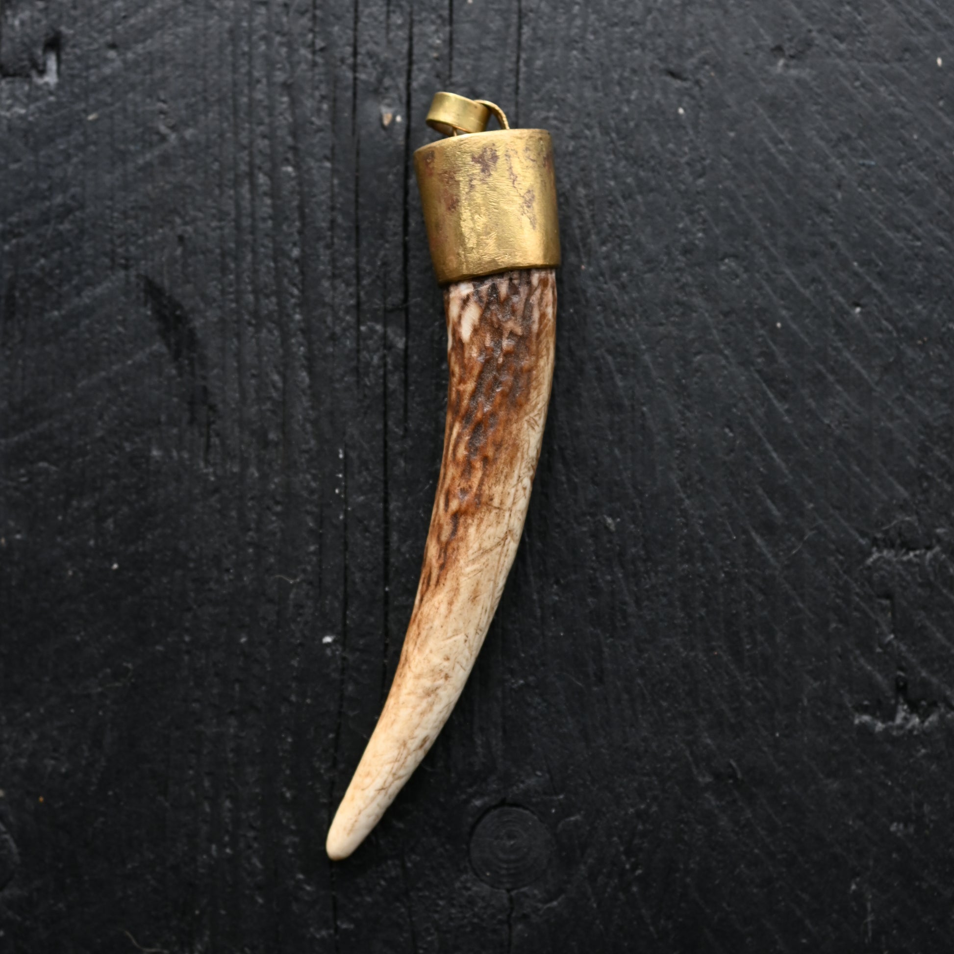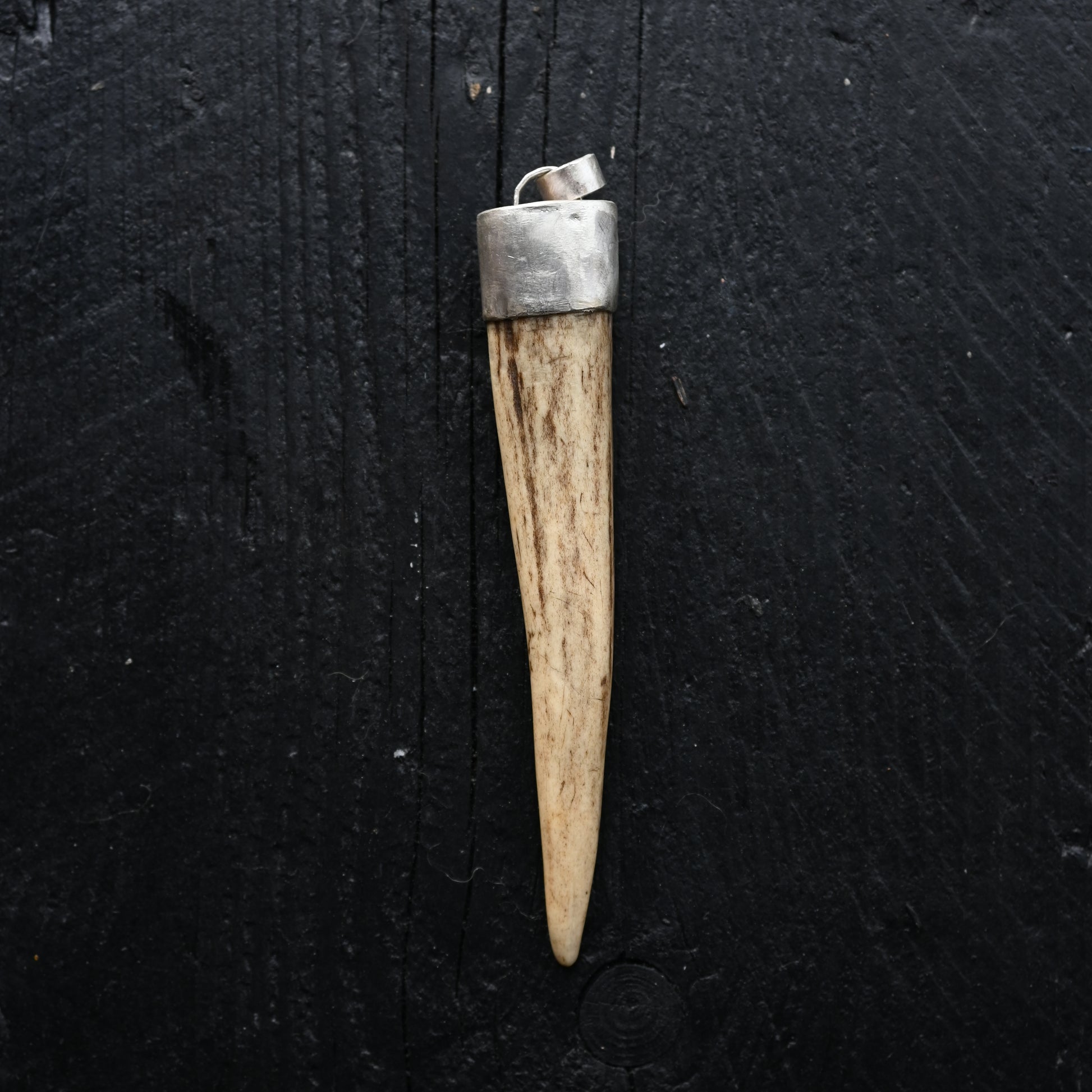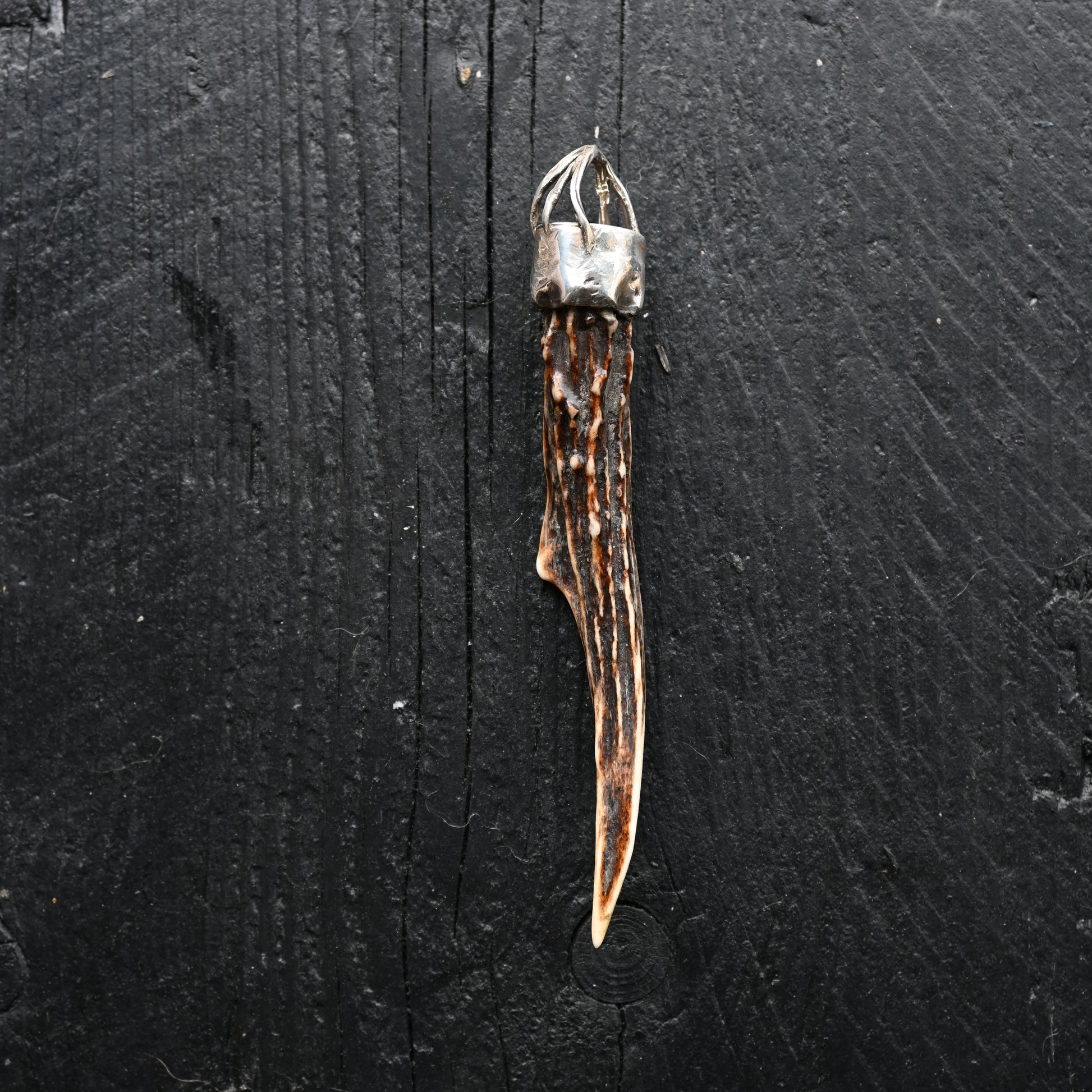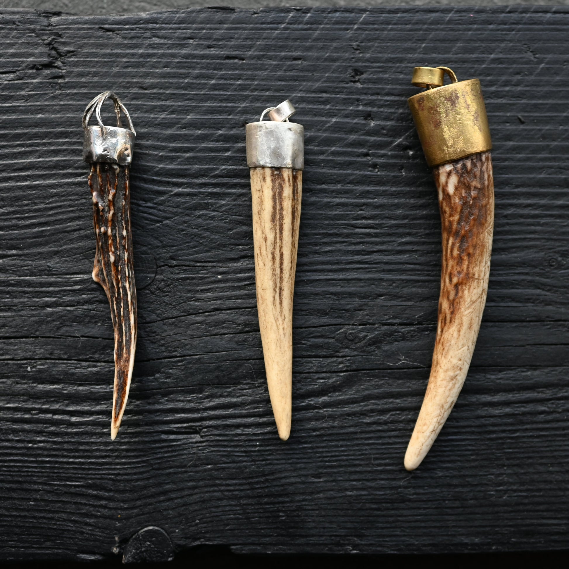 Three talismans created from foraged antlers which naturally fell off and capped, two in silver and one in brass.