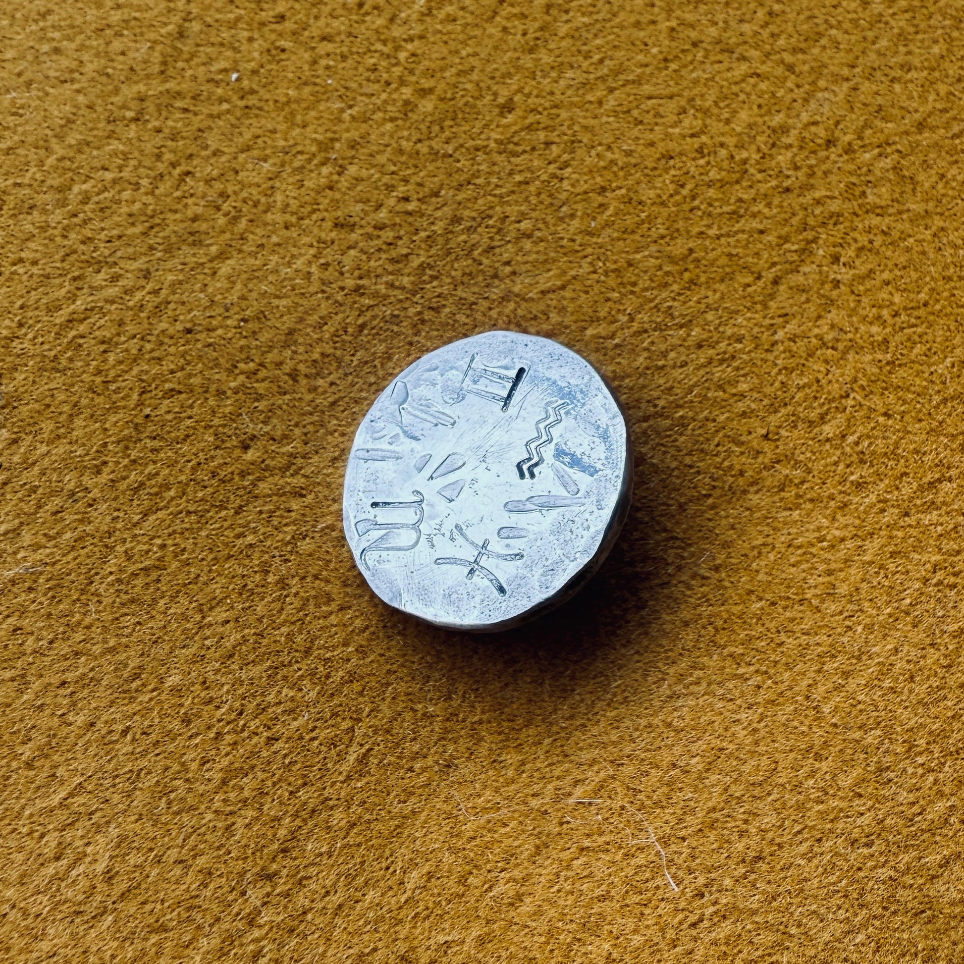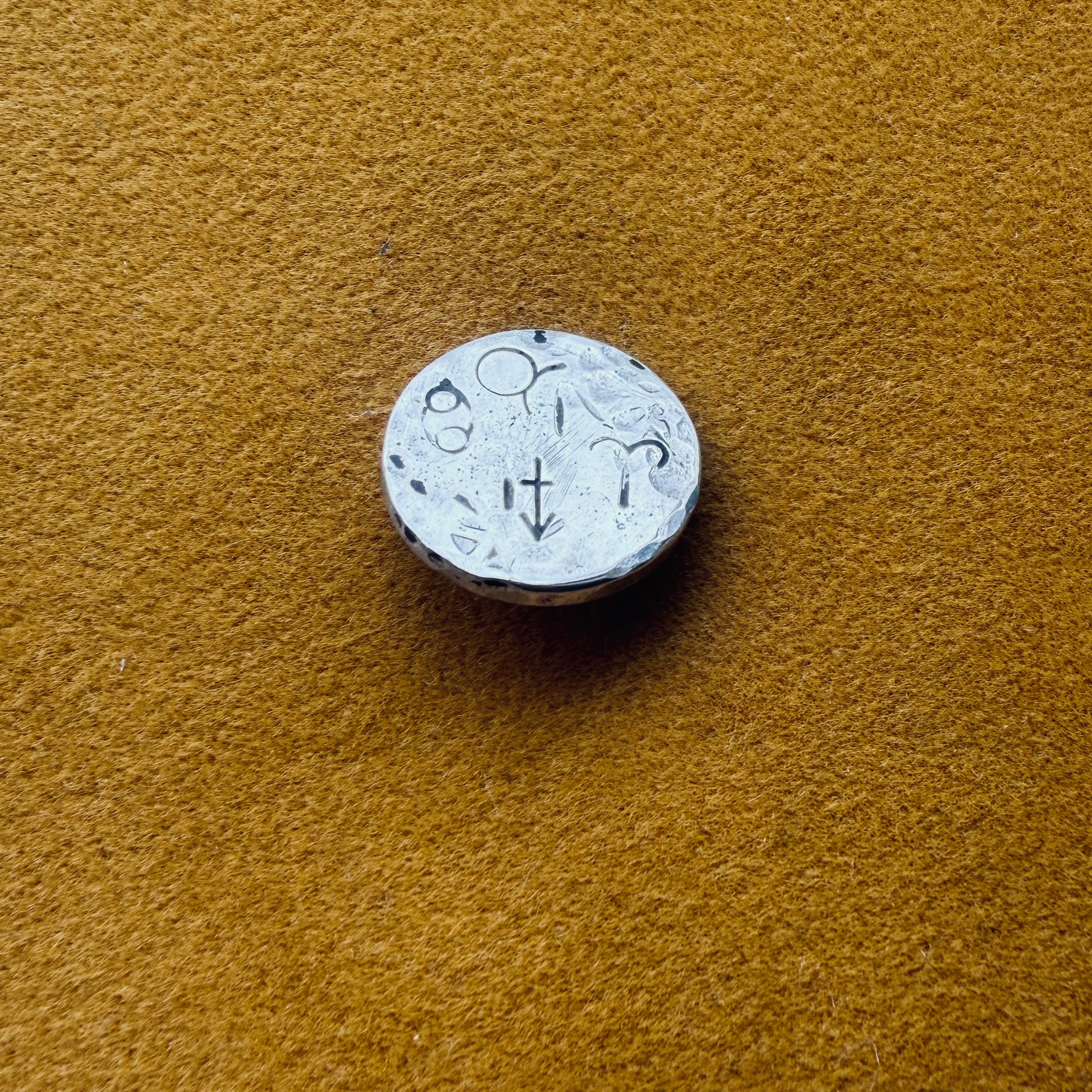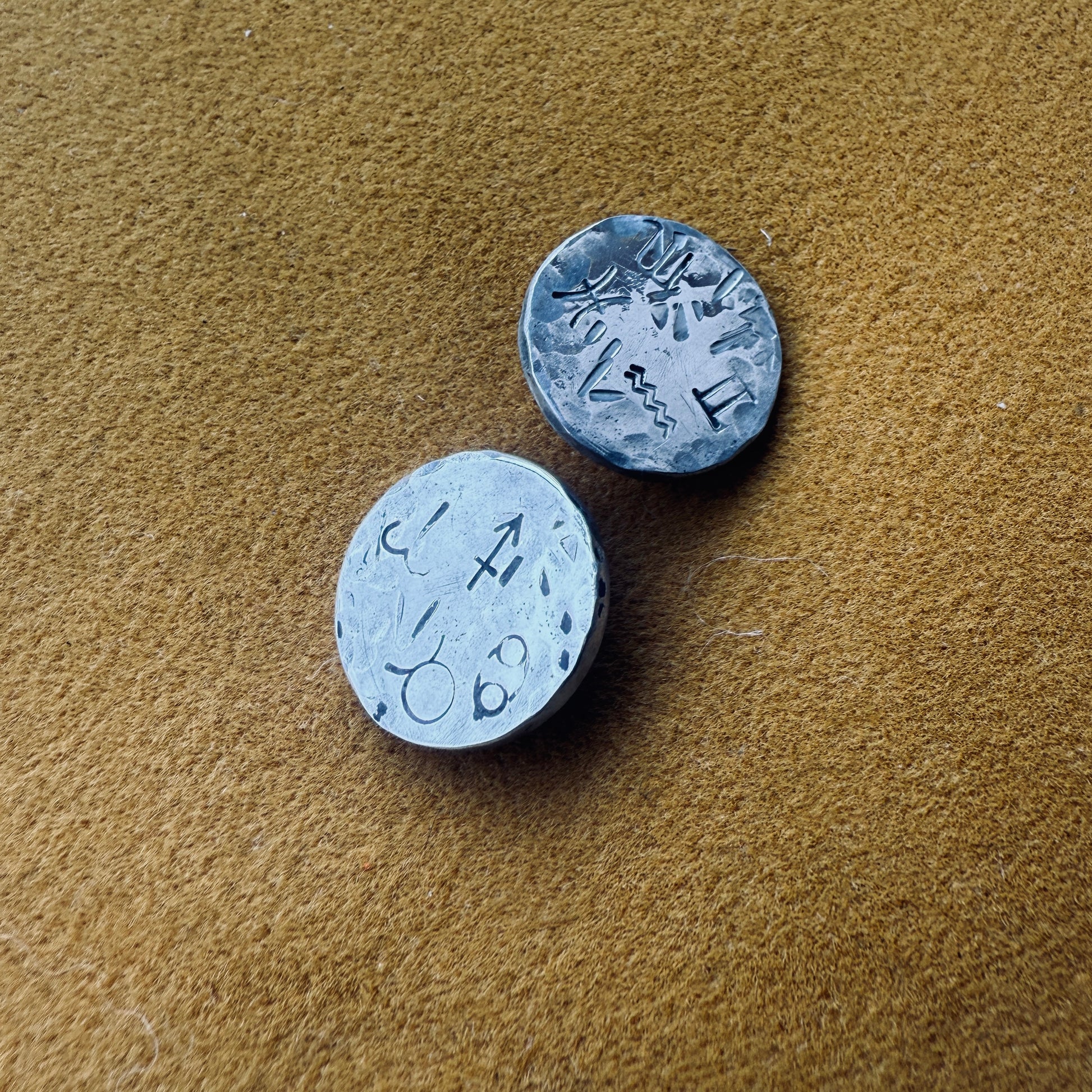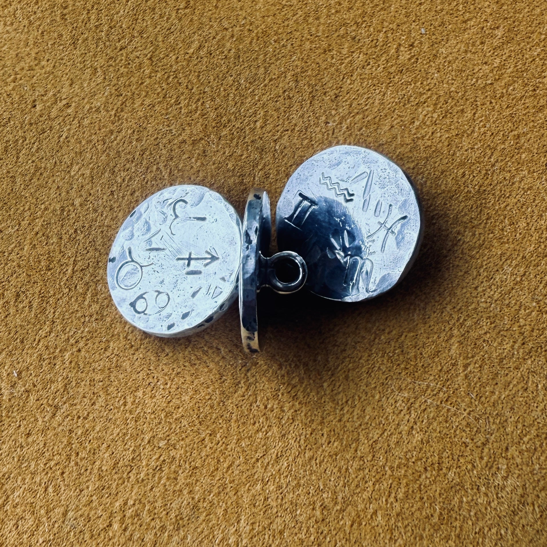 These sterling silver buttons are crafted with a distinctive, rugged finish featuring bashed markings across each piece. Some of them include detailed astrology symbols, while the others carry only the textured impressions. Made from solid sterling silver, these buttons are durable, functional, and designed to add a unique, handcrafted detail to garments or accessories. Their combination of symbolic designs and simple marked surfaces makes them suitable for both decorative and practical use. They come as single button - I think i would wear one as my top button on my denim shirt, but they could be sown into any garment or even tacked on as badge.