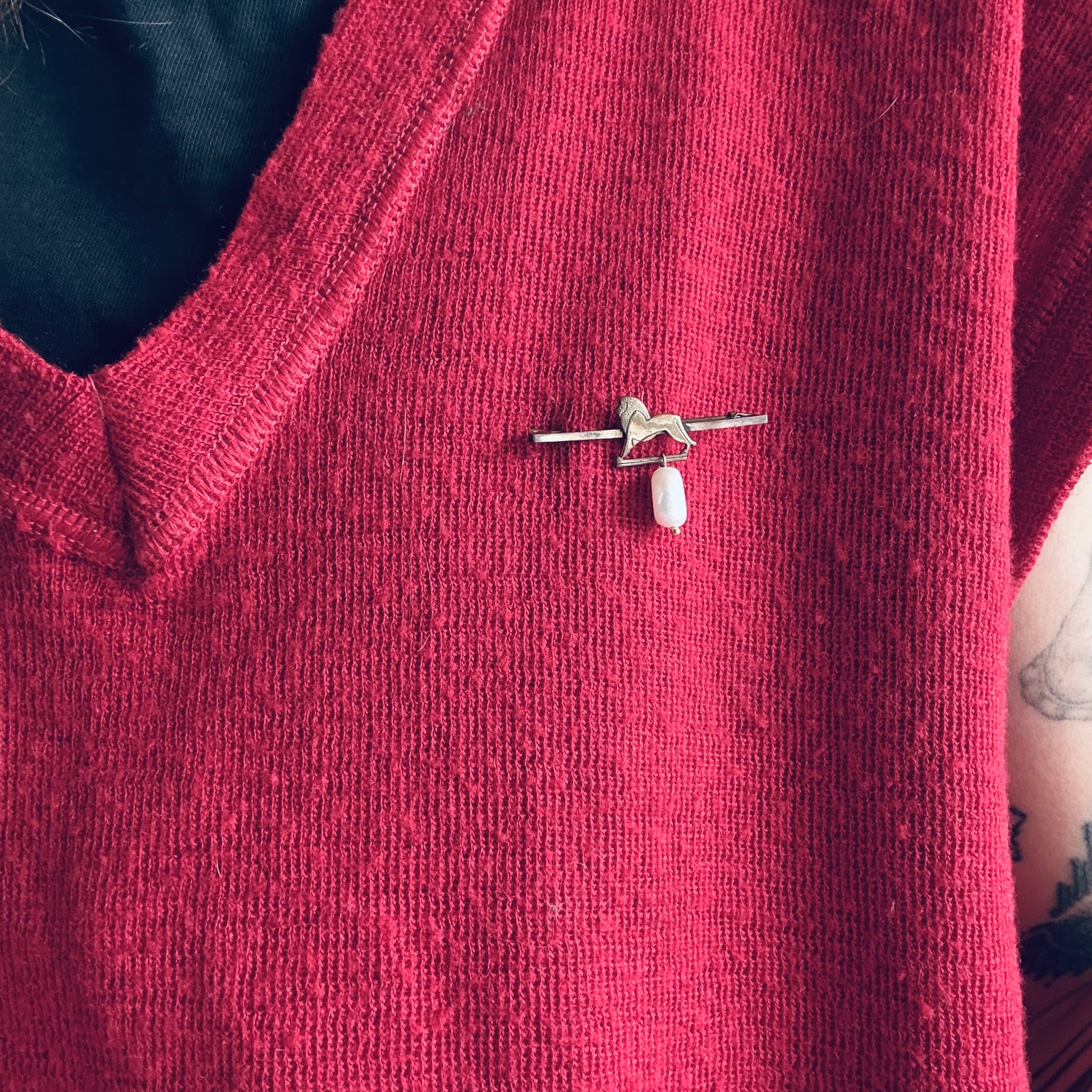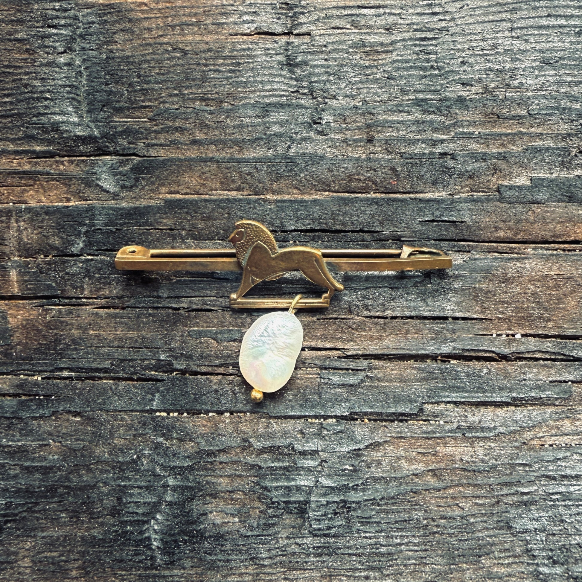 A striking vintage bronze lion brooch with a pearl swinging off it.