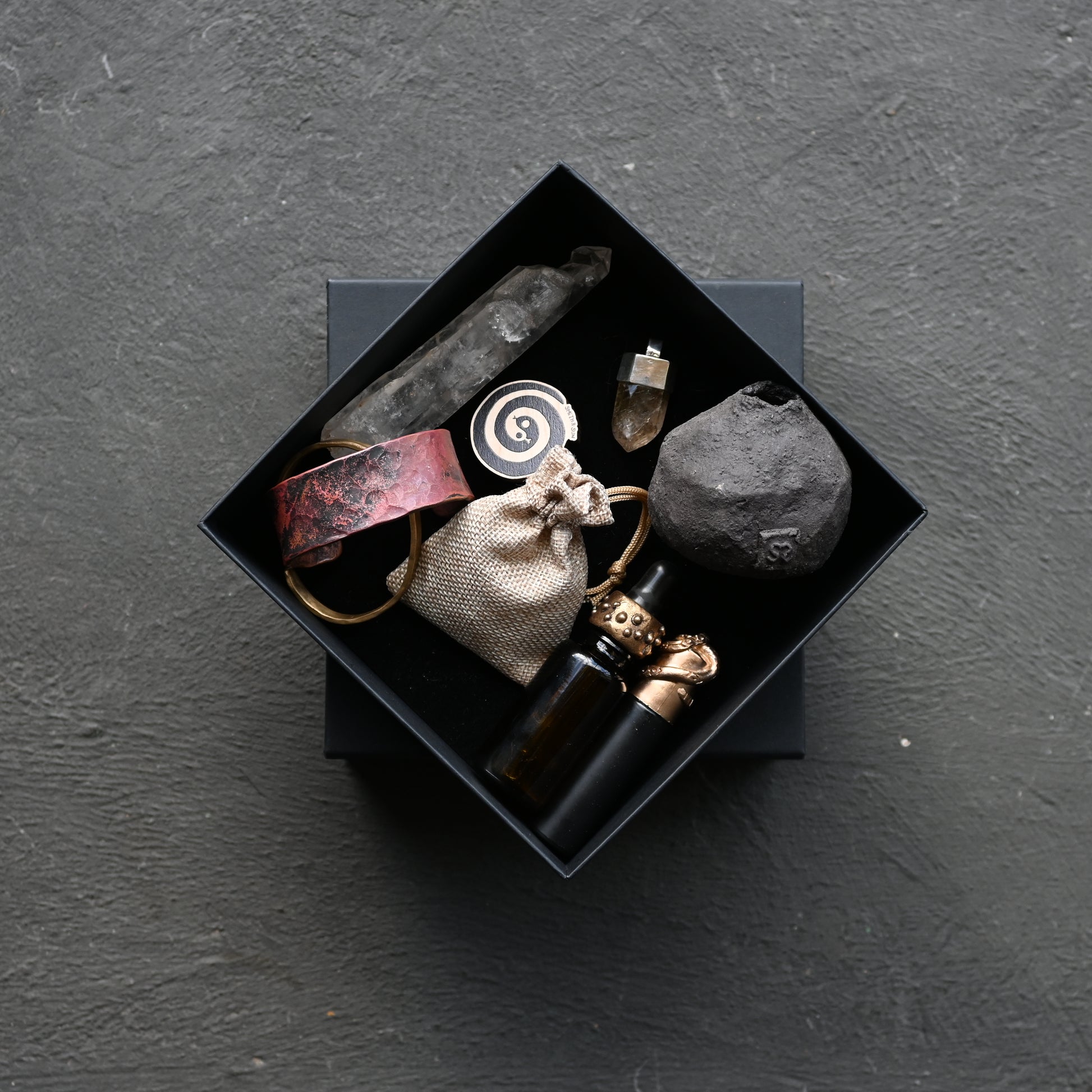 In this box you will find our snake oil in frosted black, a tincture with hand-carved bronze lid, a handmade black clay vase, small rutilated quartz pendant, a crystal of my choosing, two astral bangles (one thick, one thin), a naga badge, and some excellent and most delicious frankincense.