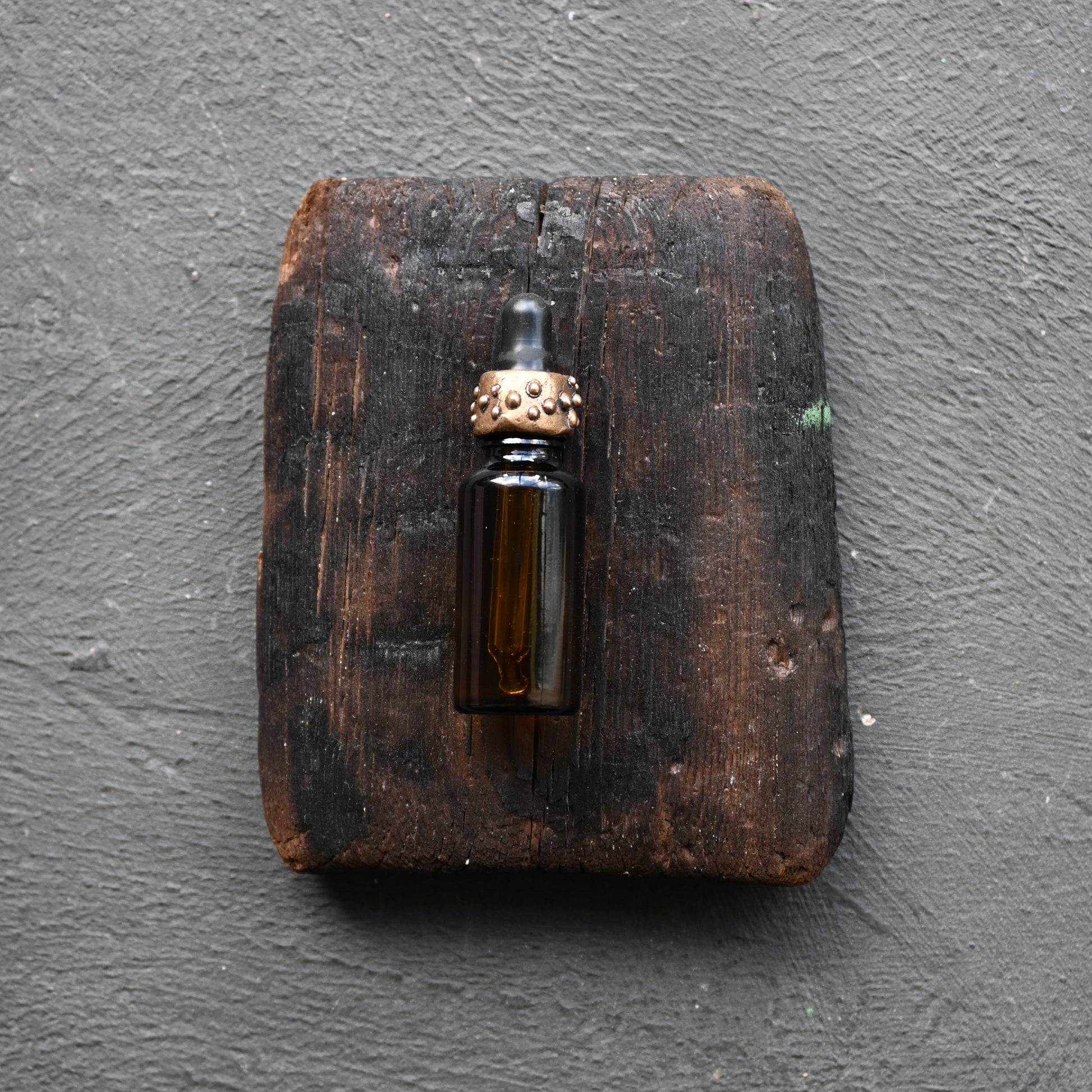 Our snake oil comes in a black frosted (10 ml) refillable vial with calming essential oils and the hand-carved lids are cast in bronze.