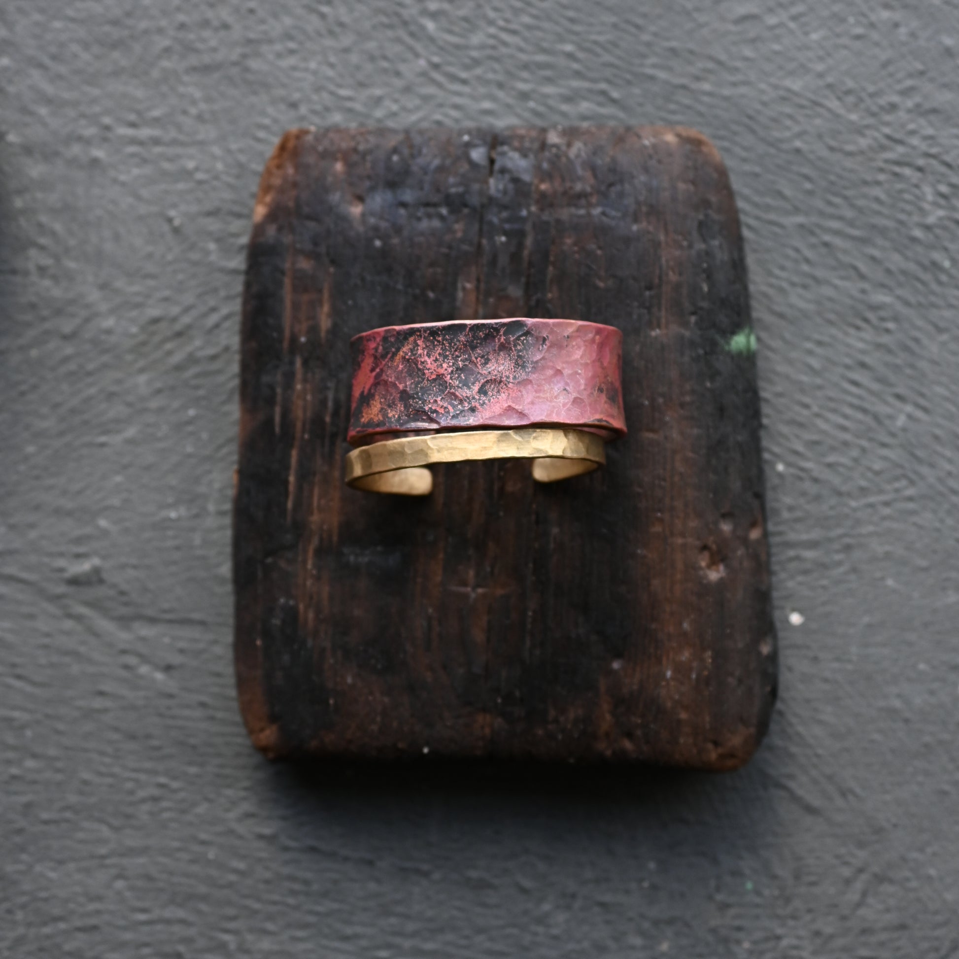 The astral bangles include two unique bracelets of different properties. The fire oxidised copper bangle is a wonderful healing and lucky metal. Copper conducts spiritual energy between individuals, crystals, the mind, and the spirit world. It grounds and transfers vibrational frequencies from the spiritual to the physical, linking to the Divine and the attributes of the Queen of Heaven. Paired with other stones or metals, it is said to enhance their properties. I've paired it with brass, a powerful material to keep close. It’s said to bring balance to chaos, sharpen the mind, promote youthfulness and openness, and even help you master time.