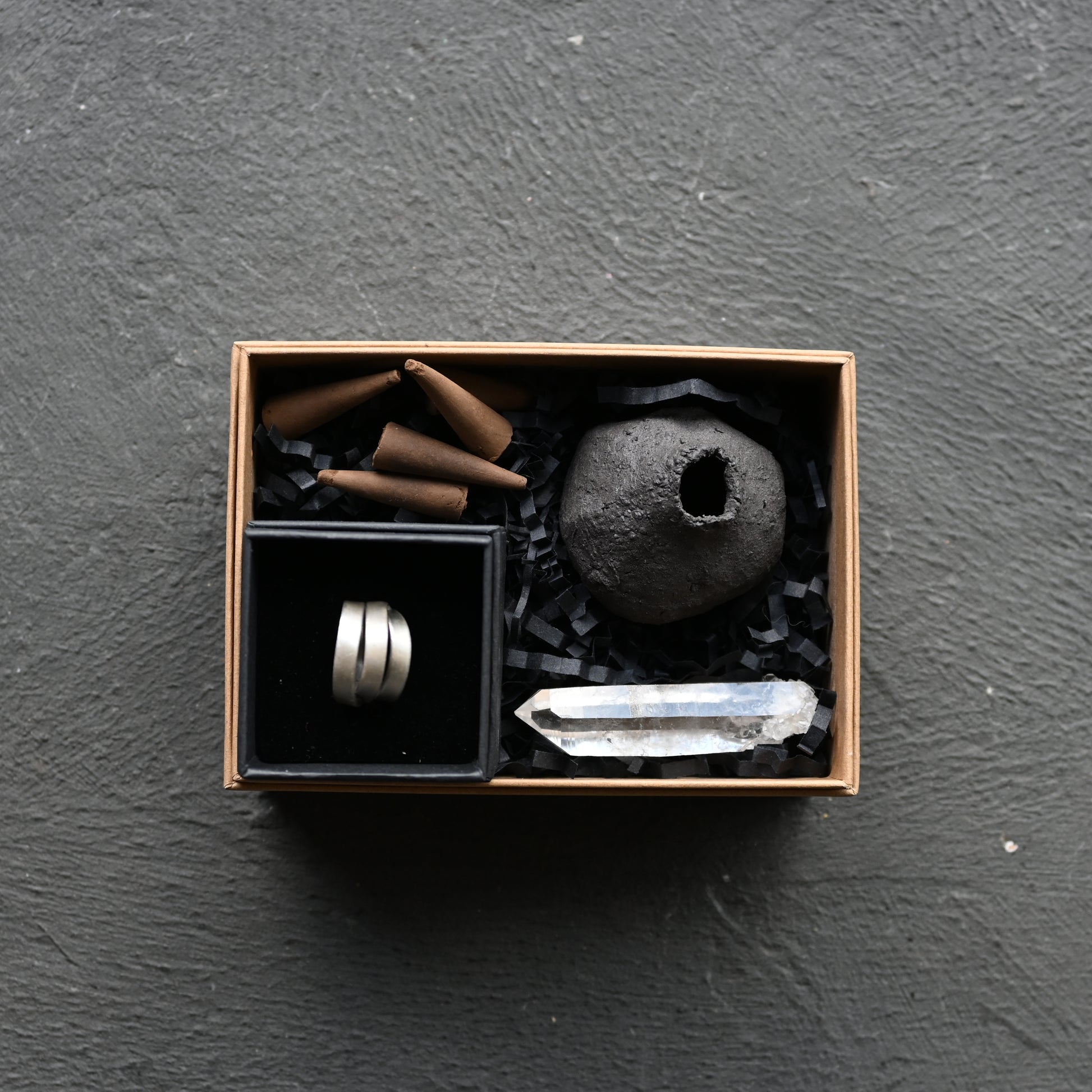 In this box you will find a charged starbrary quartz, a sterling silver wrapped ring (UK Size R 1/2), a black clay vase and five cones of incense.