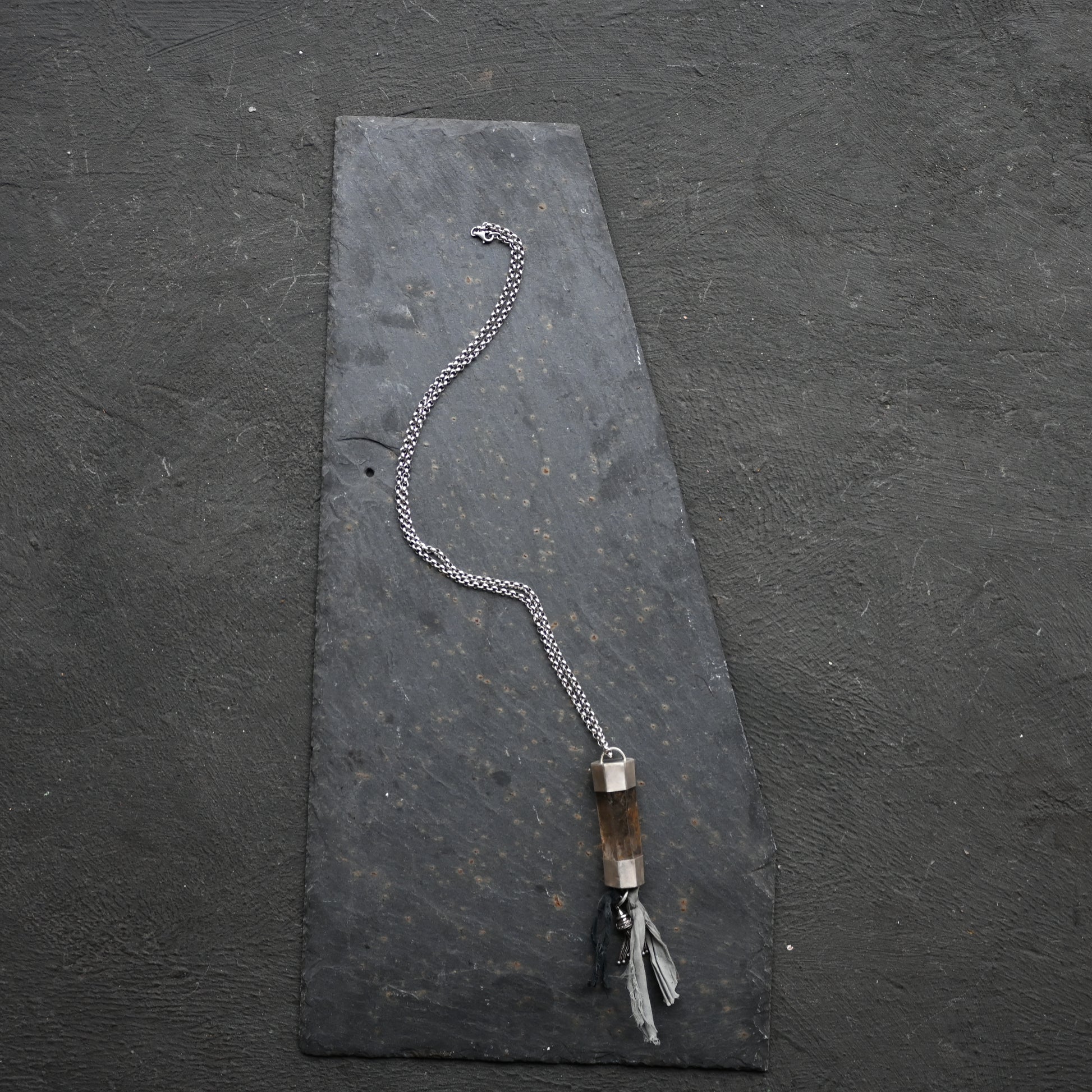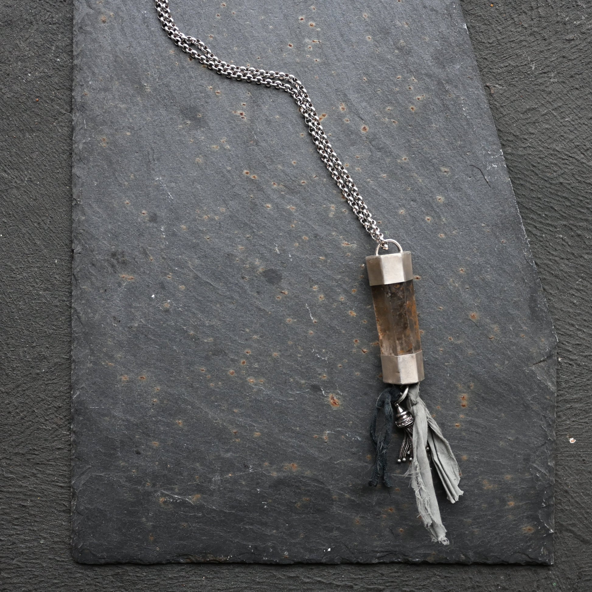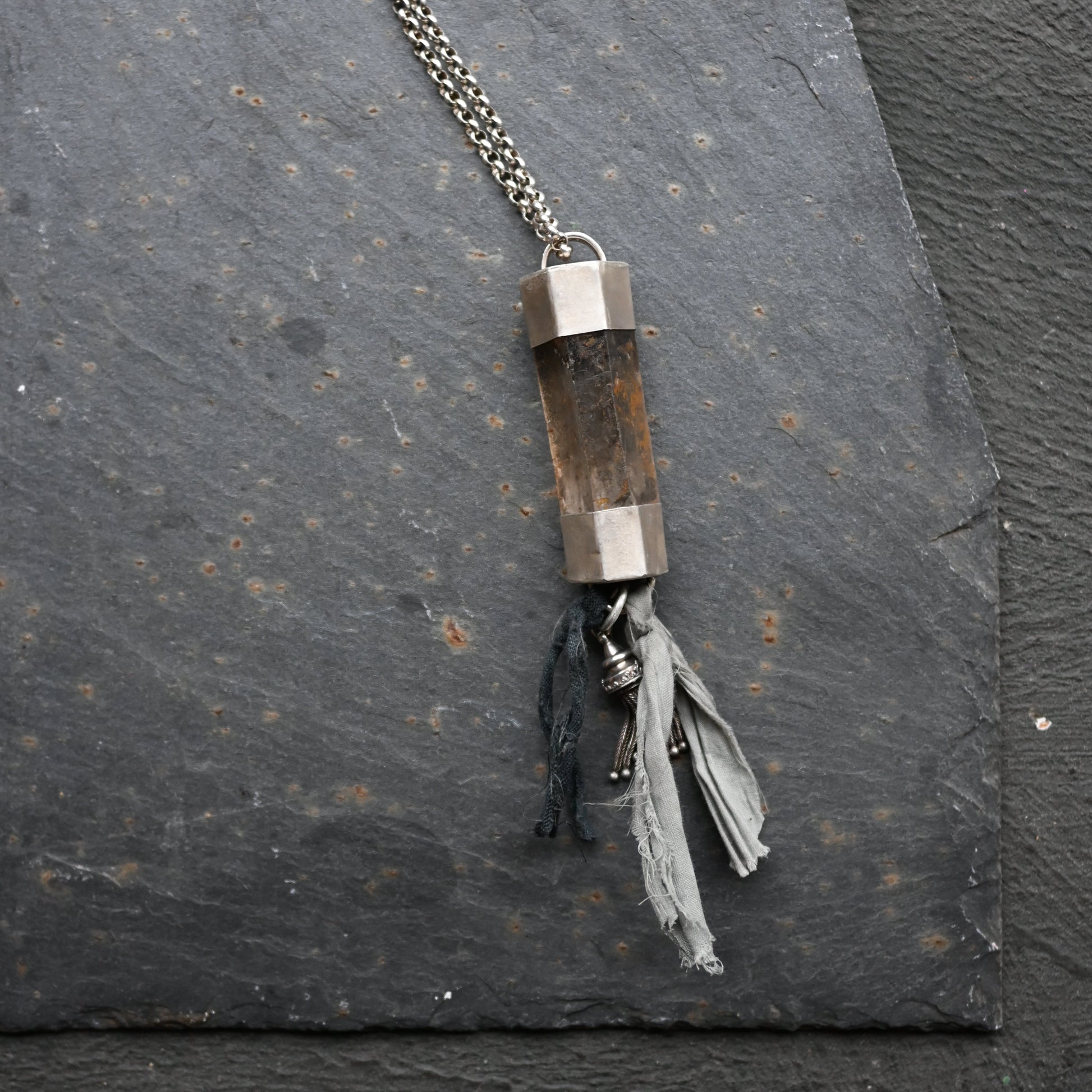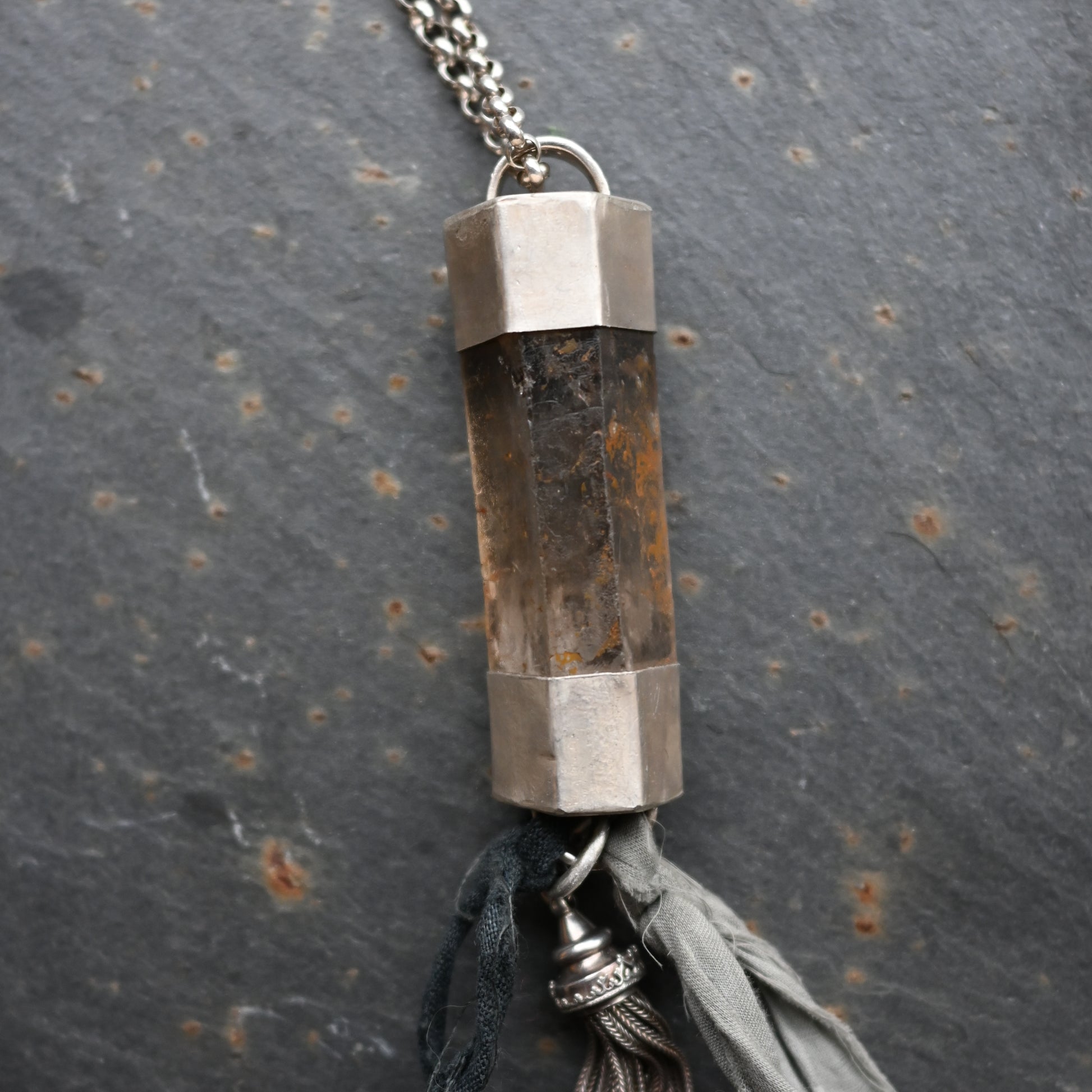 A pale smokey quartz with hematite inclusions and rainbows, double capped in recycled sterling silver with a vintage tassel and ribbon from my Nov 2024 trip to Indonesia. I envisioned the person who gets this piece to add their own talismans and blessed strings and and and to this.