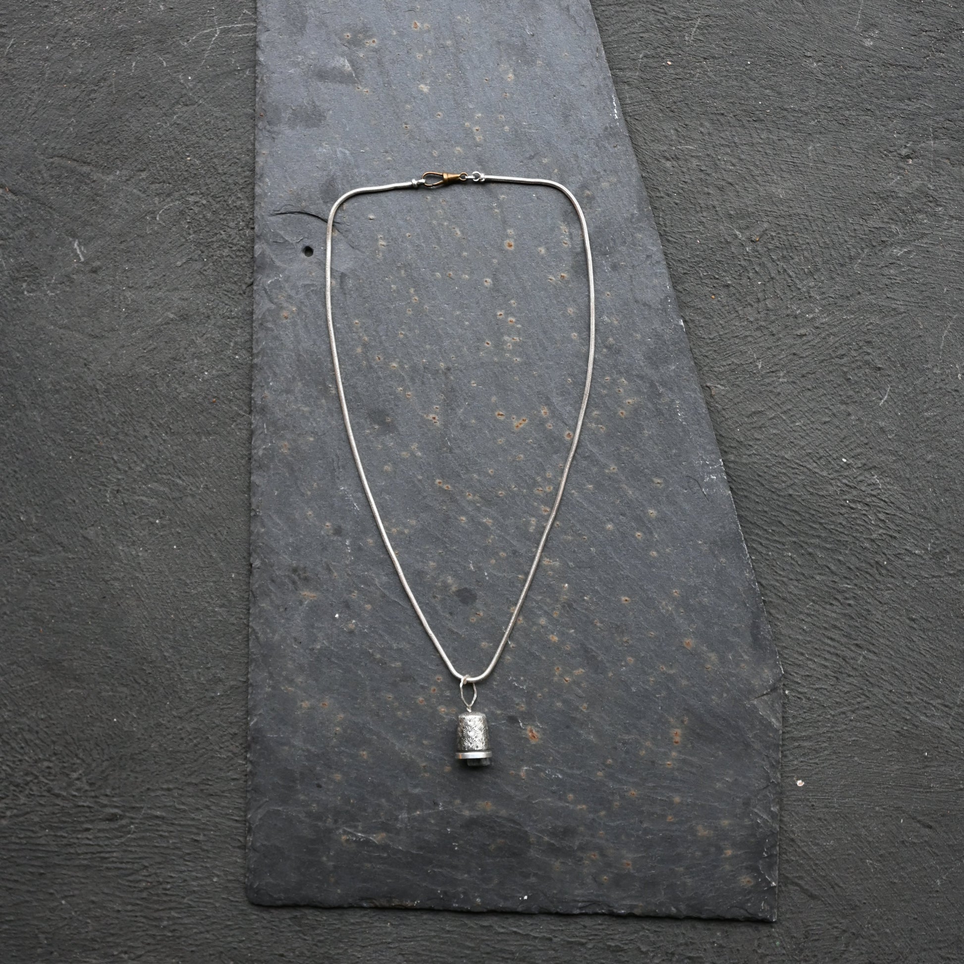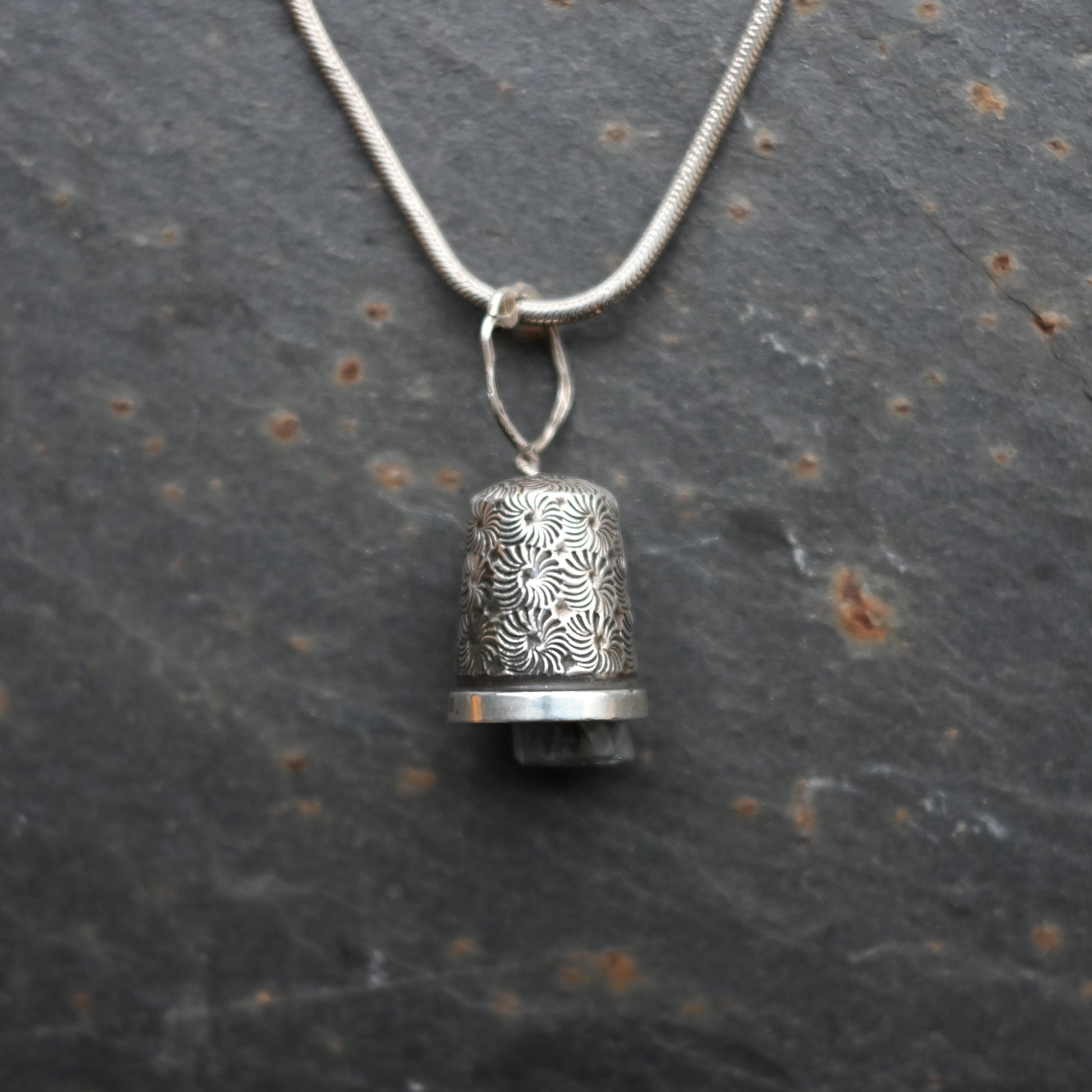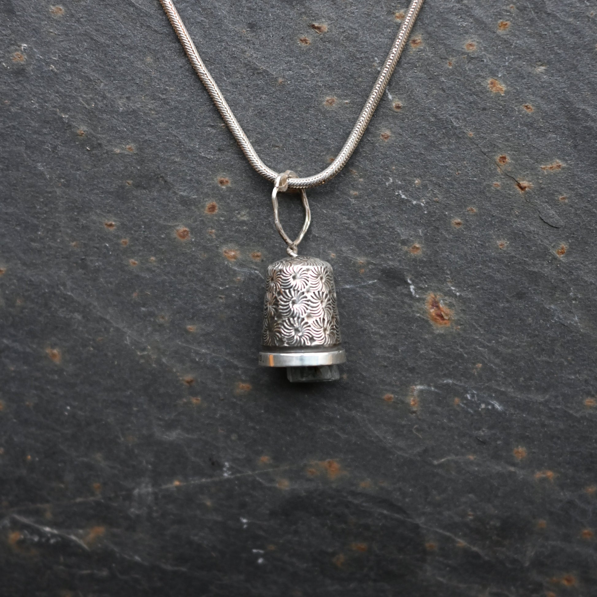 This Victorian sterling silver thimble, paired with a small aquamarine also set in 925, hangs off on a sterling silver snake chain with a antique alloy albert clasp.