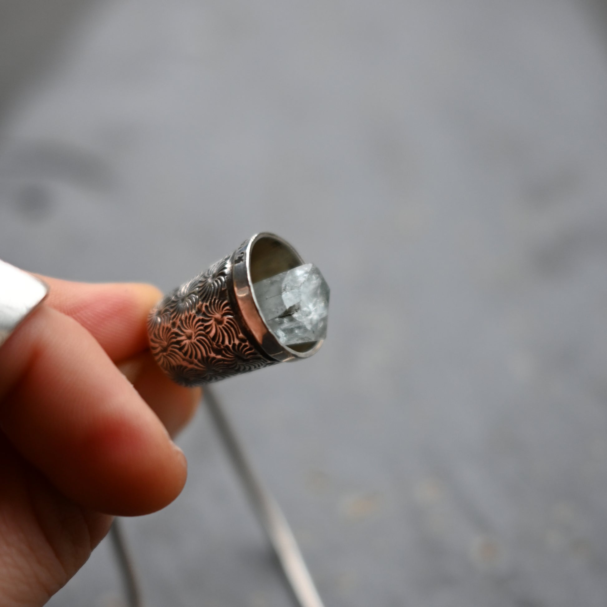 Aquamarine has its own long history of symbolism, traditionally associated with calm, clarity, and protection. Once believed to be the treasure of mermaids, it was carried by sailors as a talisman for safe passage across water. Its cool blue tone has come to symbolise serenity and truth, lending a gentle, grounding presence to the piece.