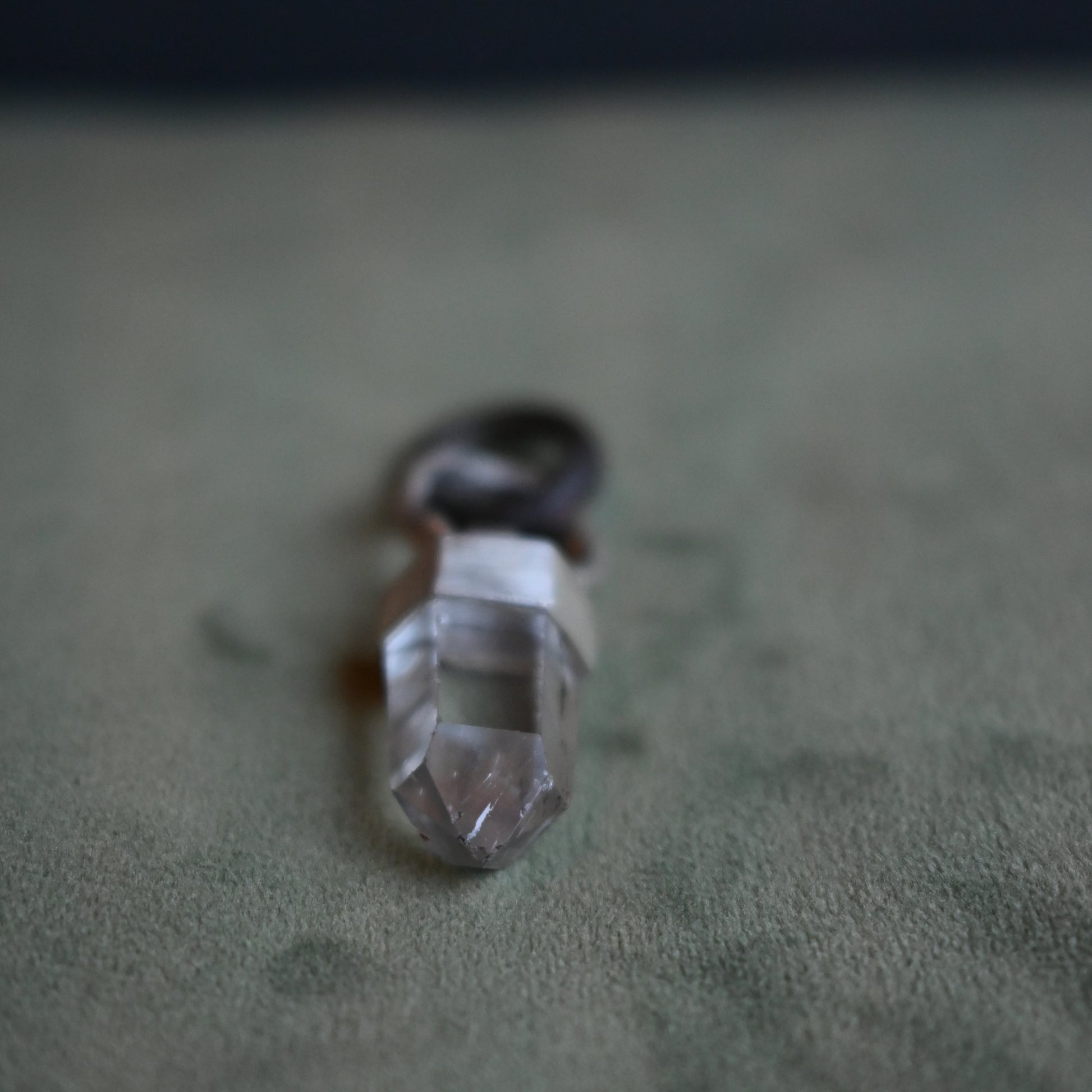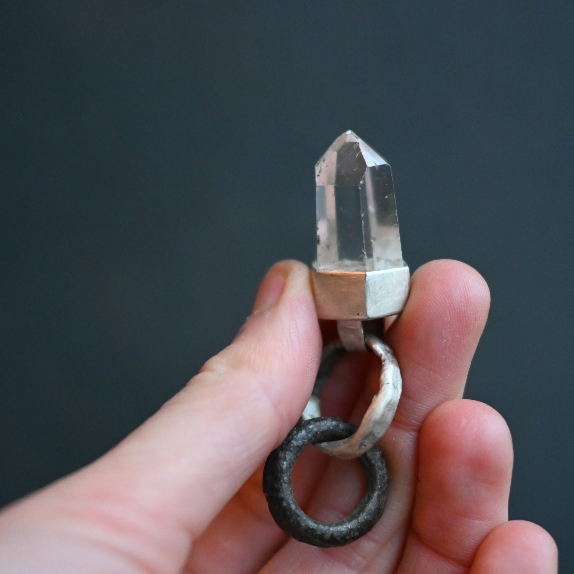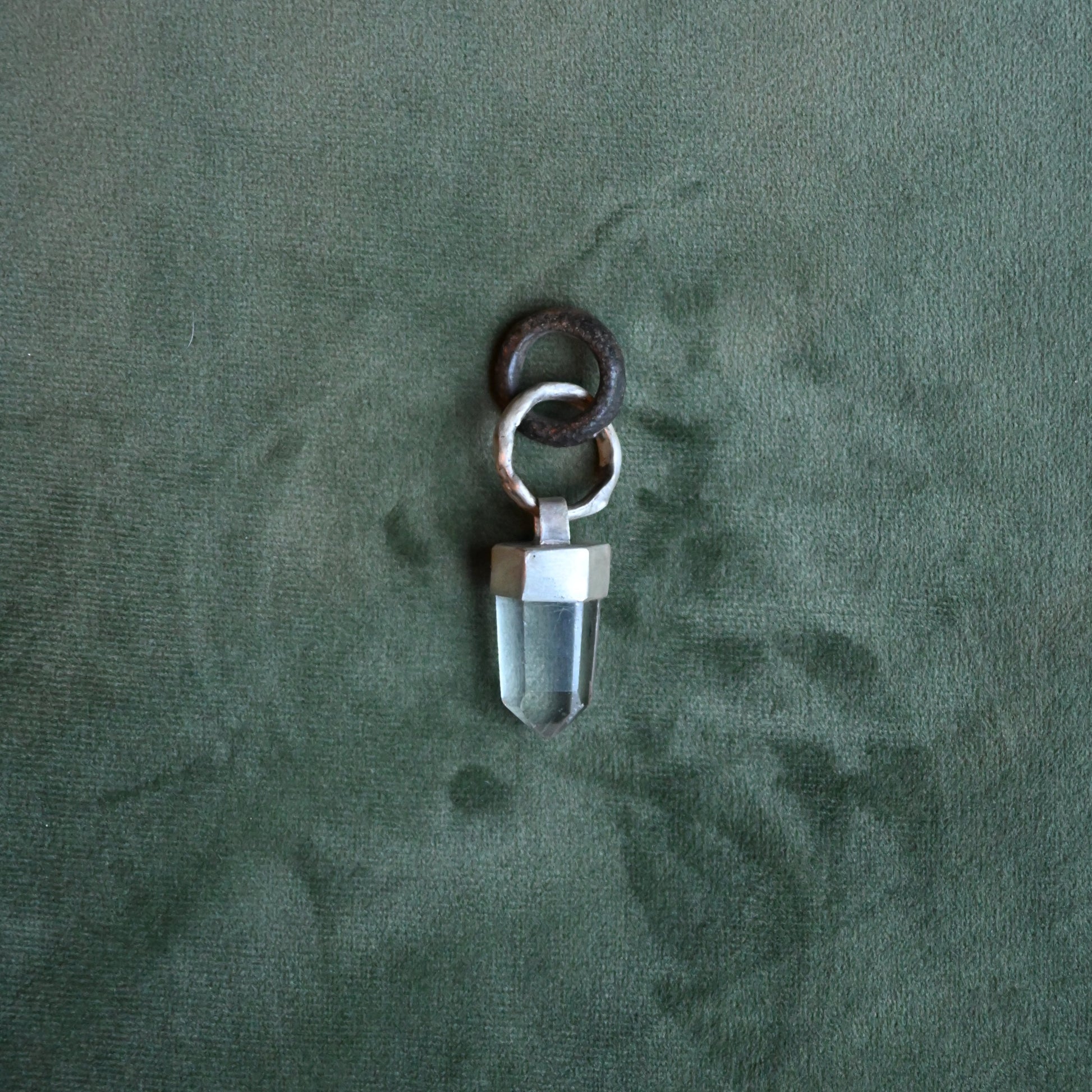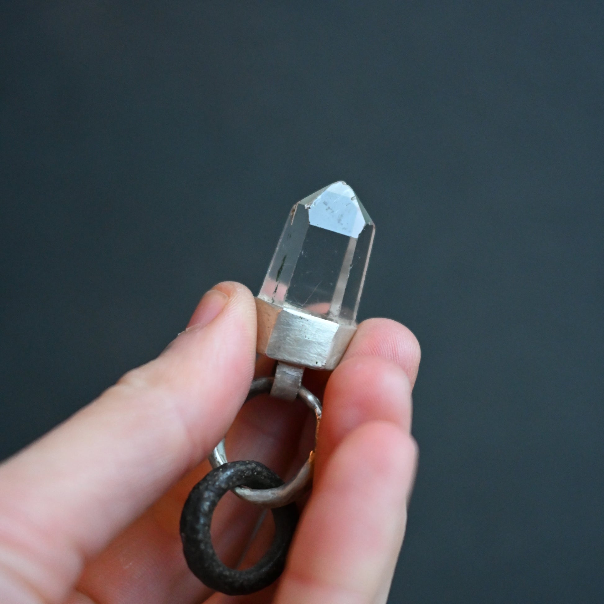 A clear quartz pendant with a small inclusion of hematite buried within, it's capped in sterling silver, and hangs off a sterling silver buried band and a celtic bronze age coin.