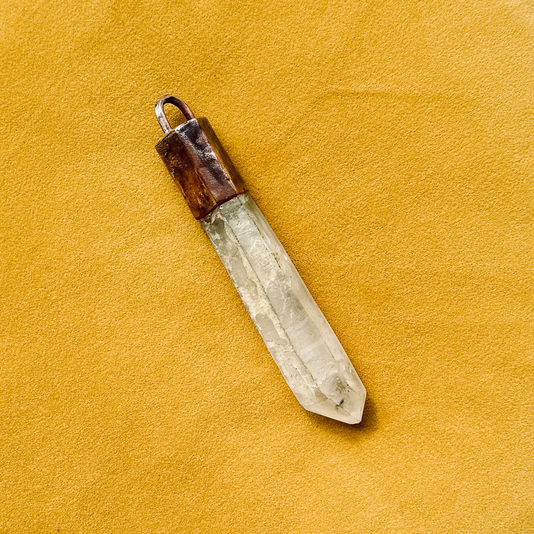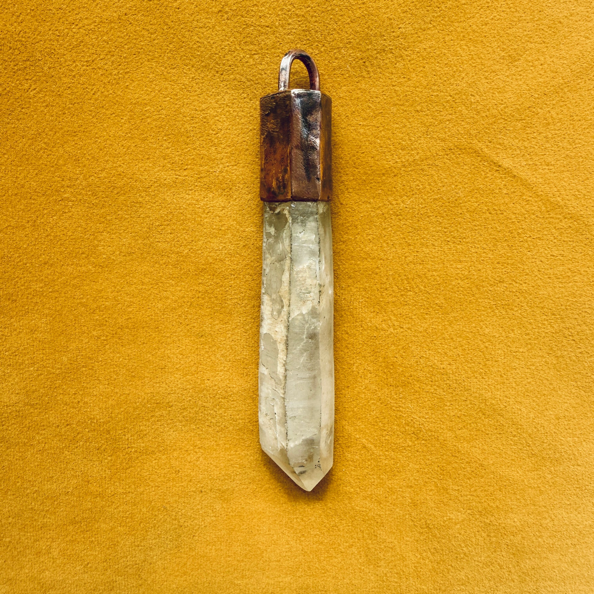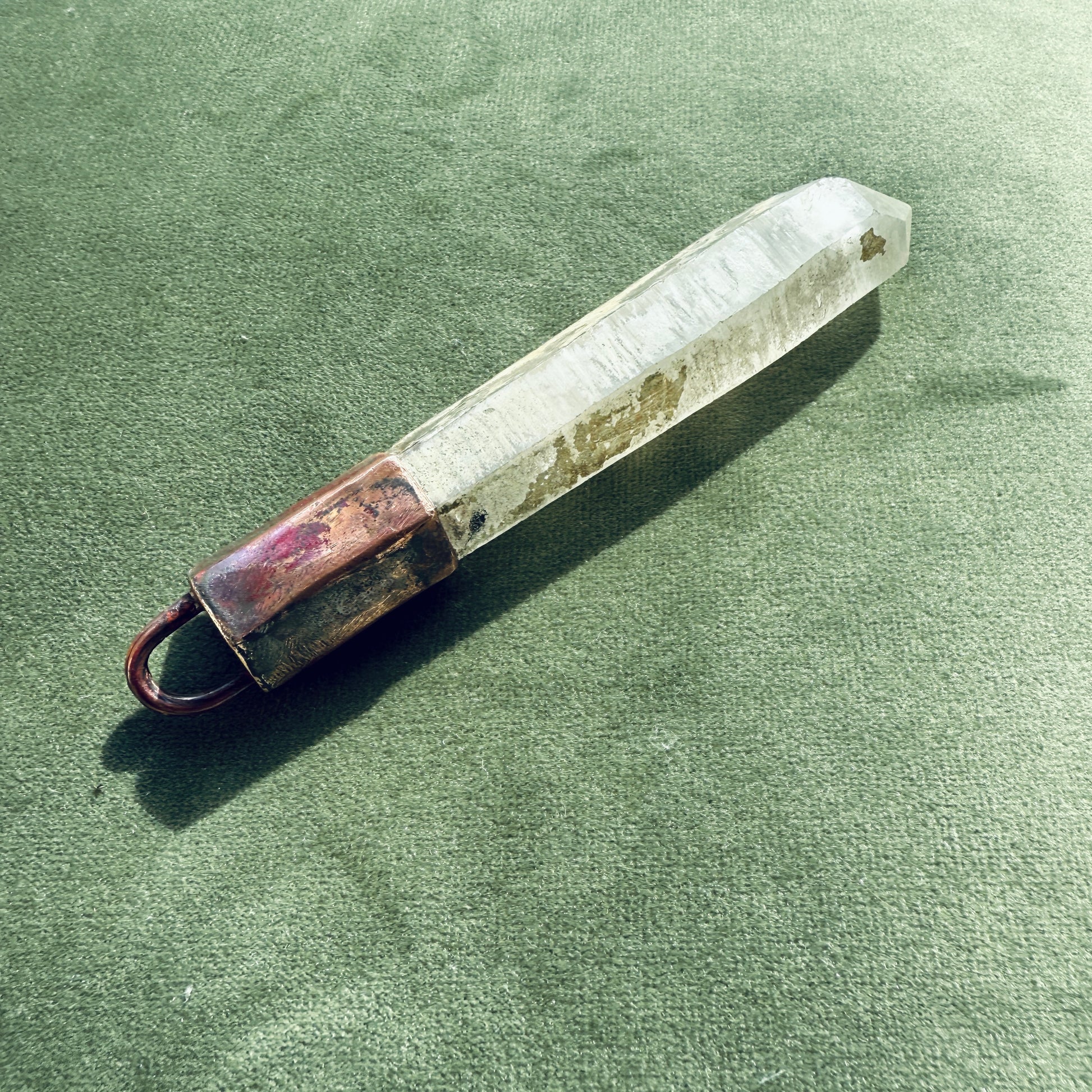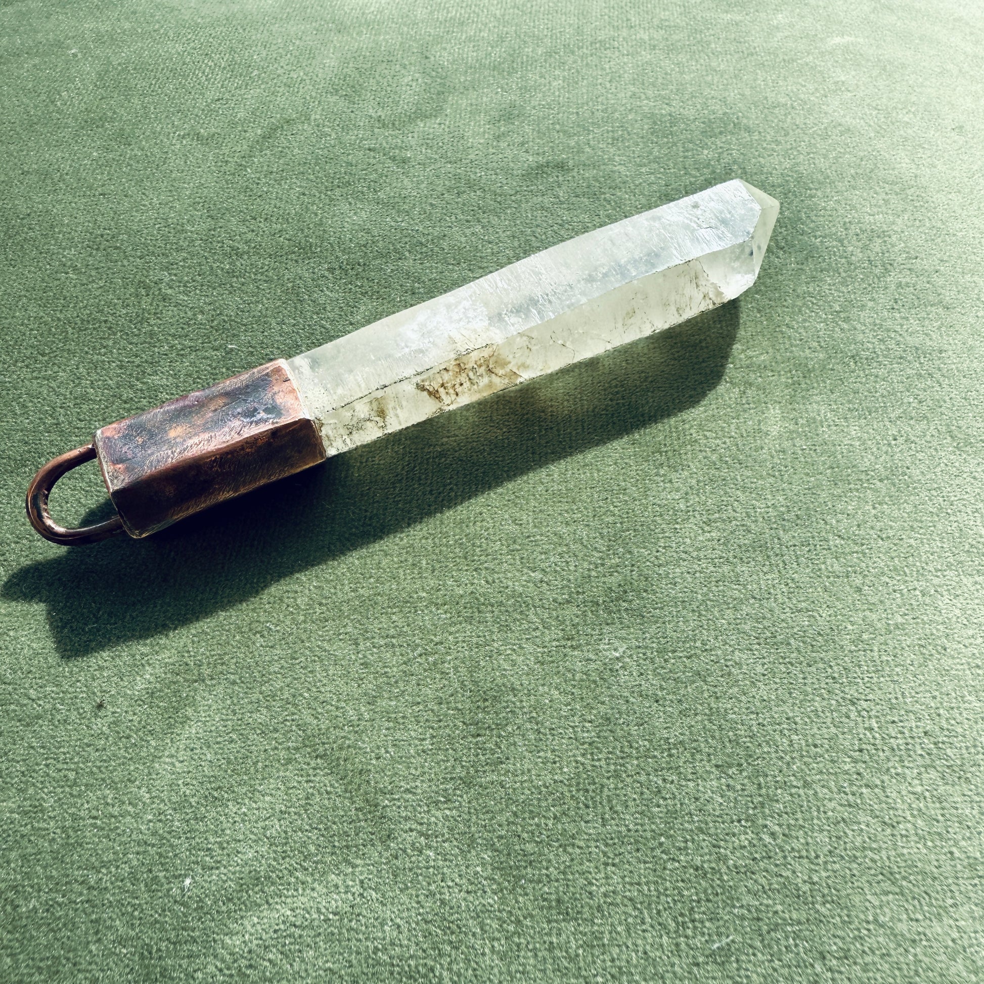 This Brazilian Lemurian quartz wand, capped in copper, is a powerful tool for both energy work and meditation. Lemurian quartz is said to be encoded with ancient wisdom from the lost civilization of Lemuria. They are unlocking spiritual knowledge and connecting the user to higher realms of consciousness.