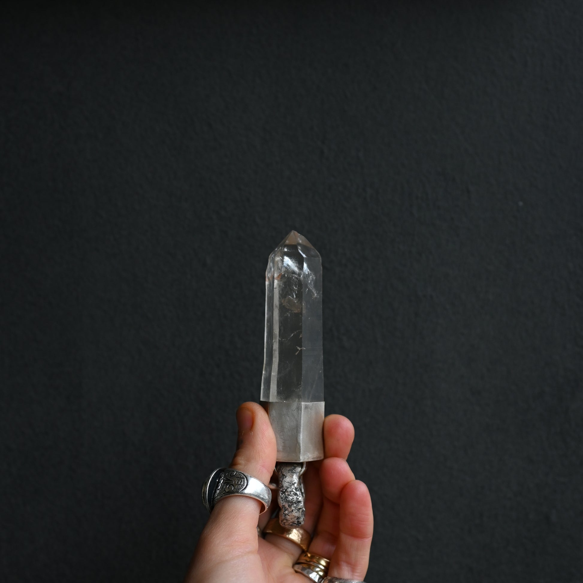 A large clear quartz with a smidge of hematite and a wee rainbow capped in sterling silver with a silver buried band. This is an epic piece - one of those stand out ones.