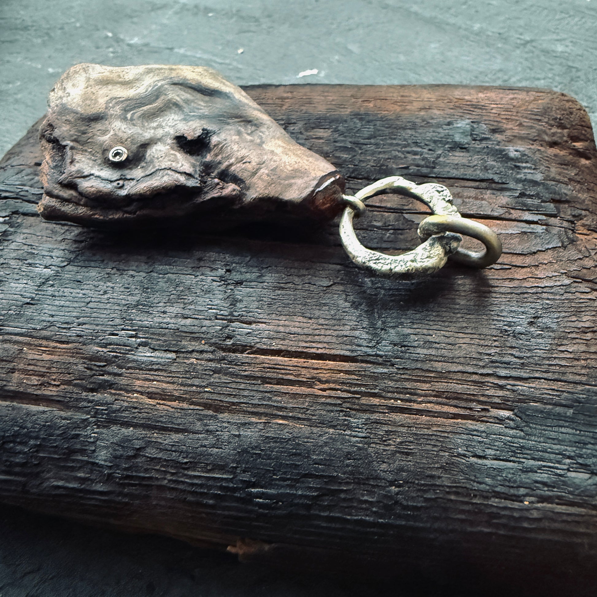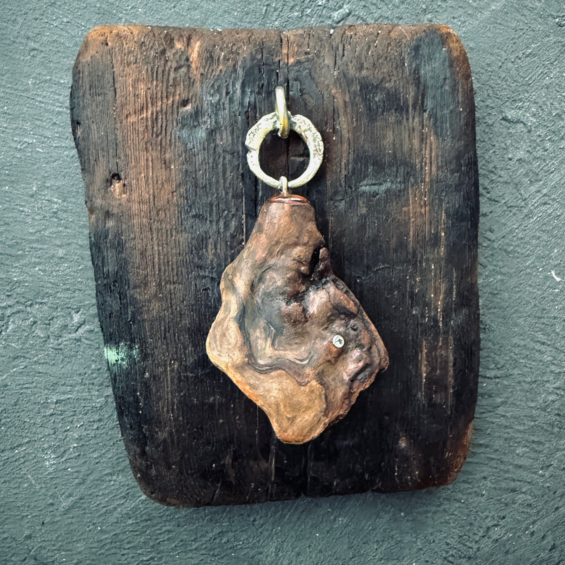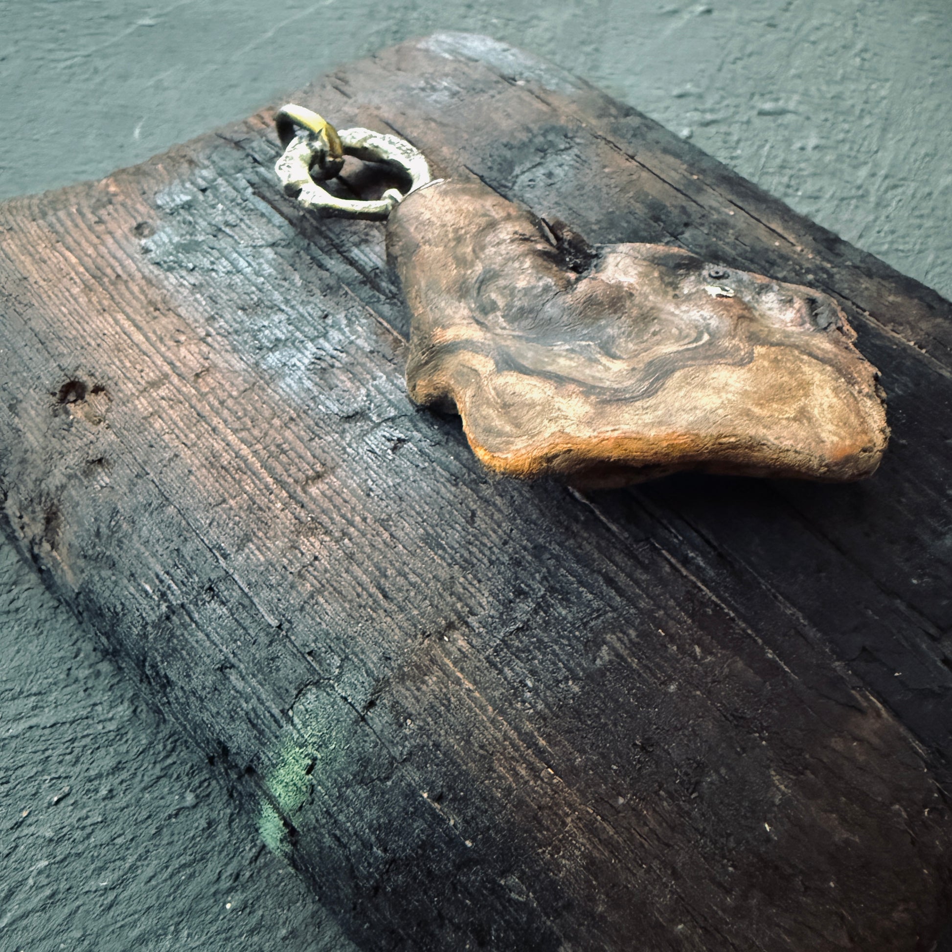 The wood has been in my personal collection for a while, until I was drawn to cleanse it, anoint with oils and add a small CZ and offer it back into the world.A sterling silver buried band sits at the top, a beautifully raw band which is hand-forged, egg-patina oxidized, lightly polished, and totally unique so you can hang a chain. This is a really special talisman.