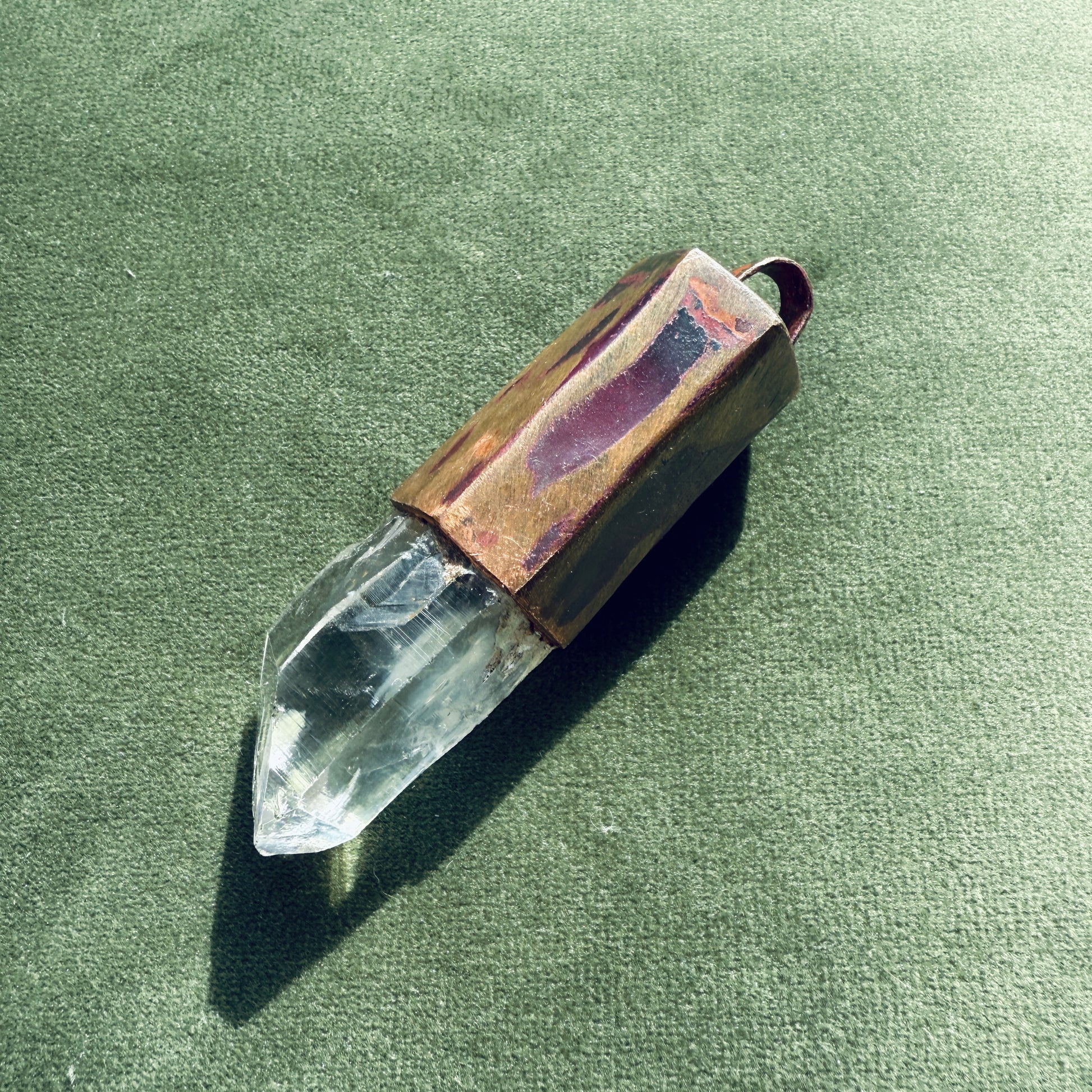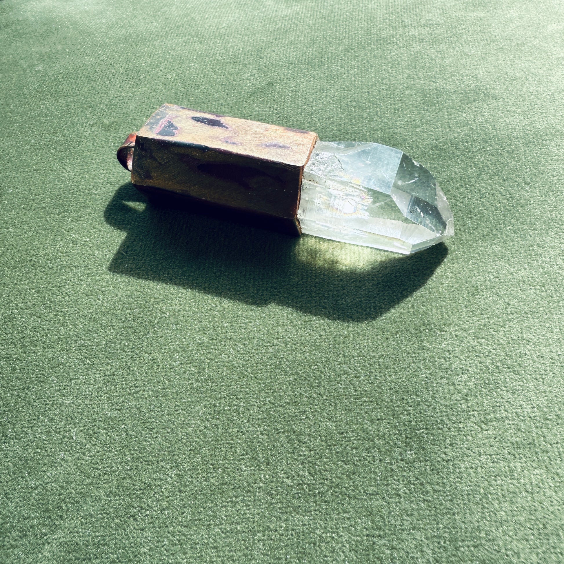 This channeling quartz master healer quartz has a beautiful rainbow at its tip and capped in copper.