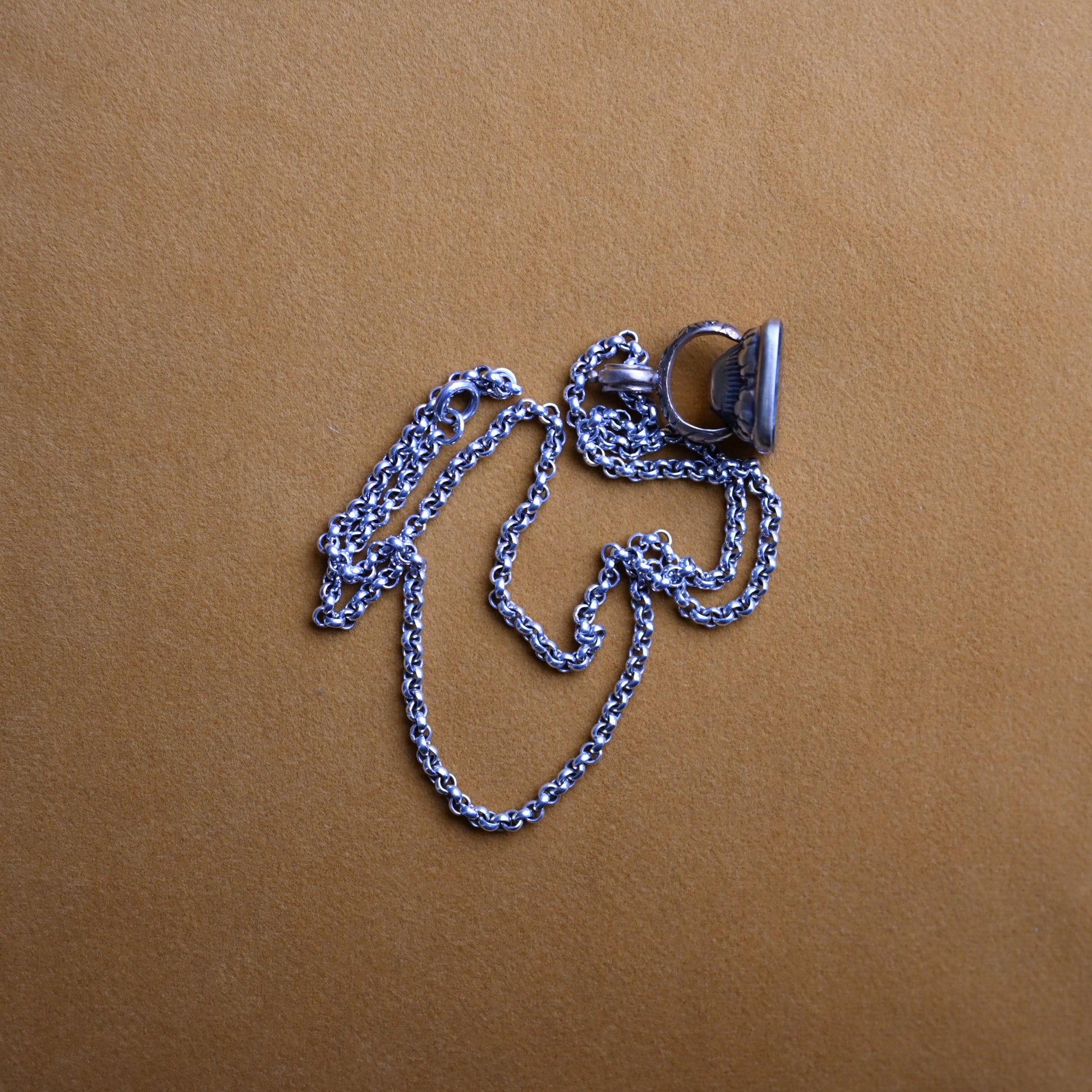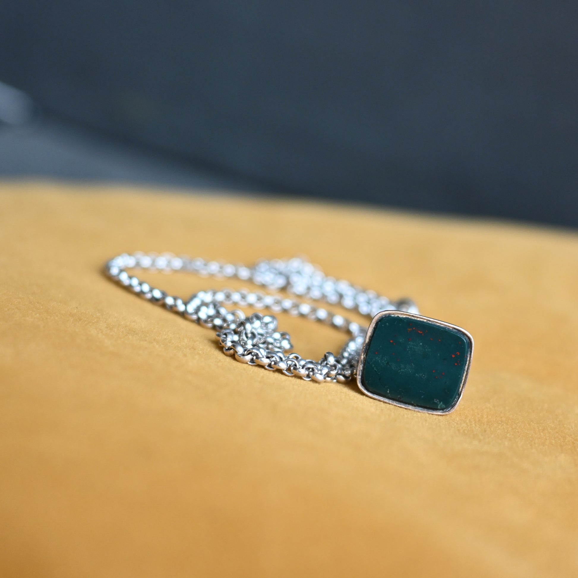 This antique bloodstone brass (rolled gold) Victorian fob pendant is paired with a vintage sterling silver rolo chain.