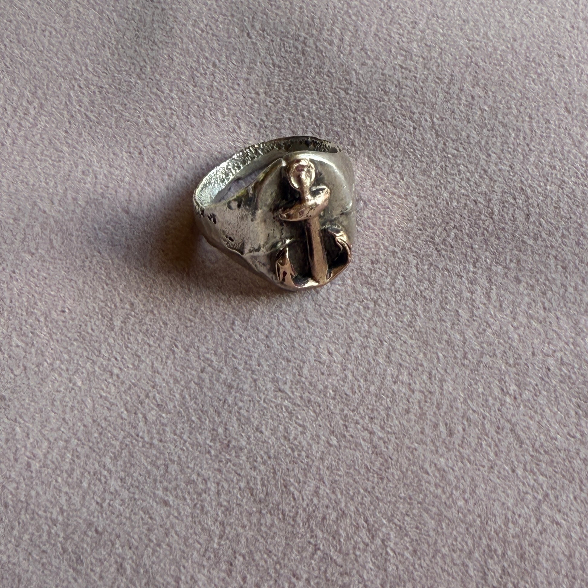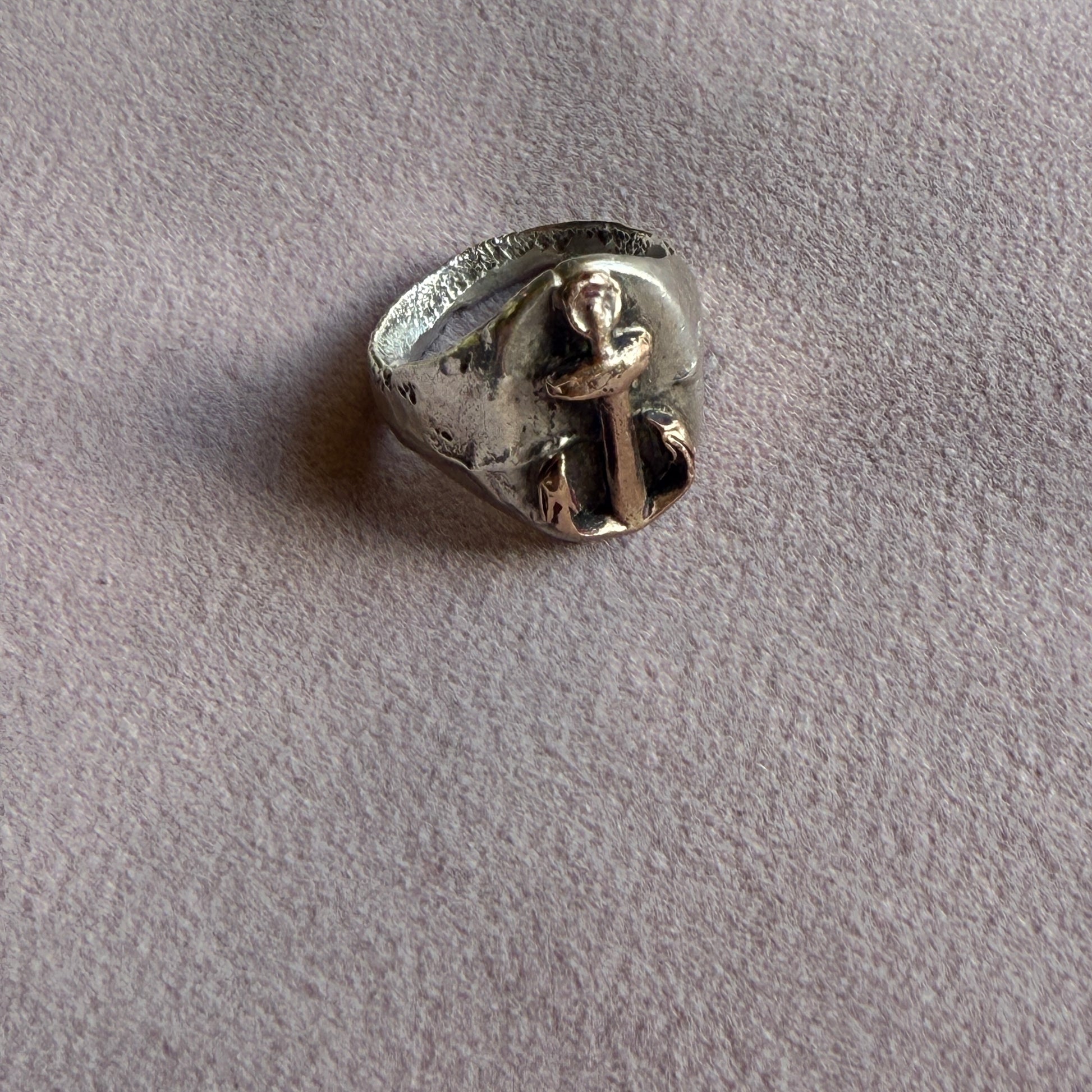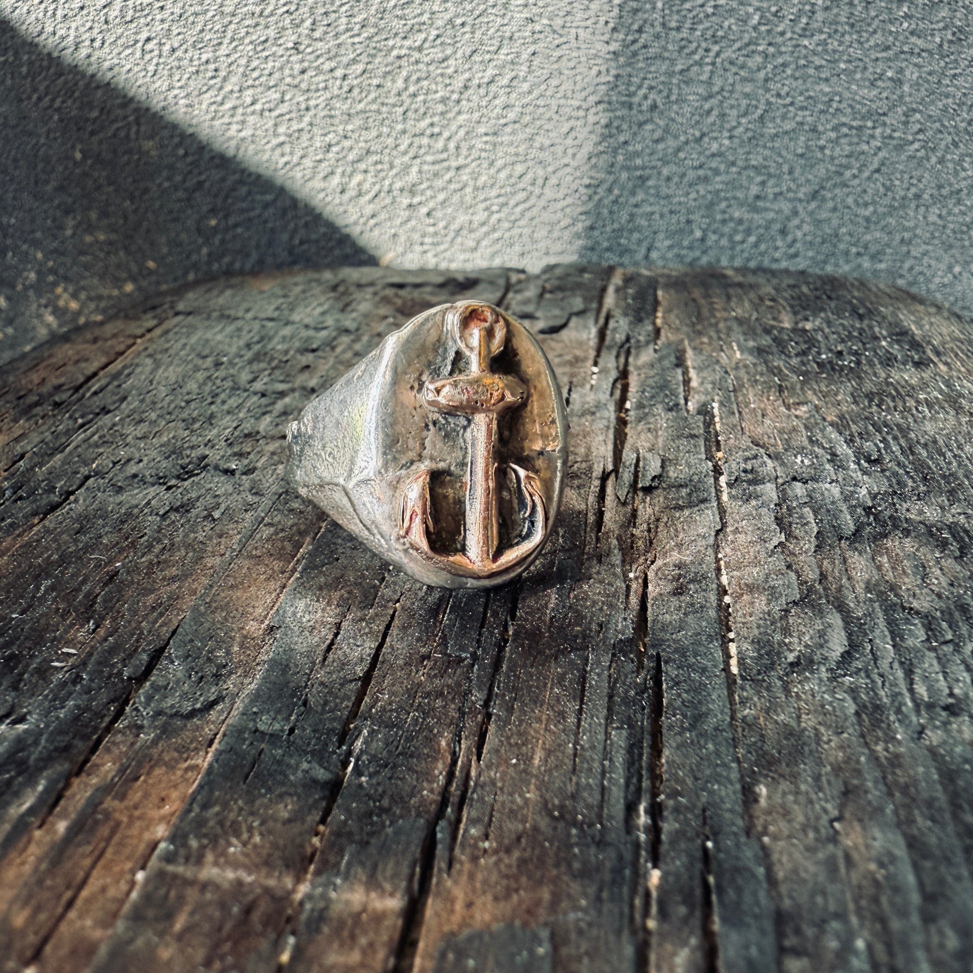 Solid sterling silver ring with hefty antique Victorian 9k gold anchor charm.