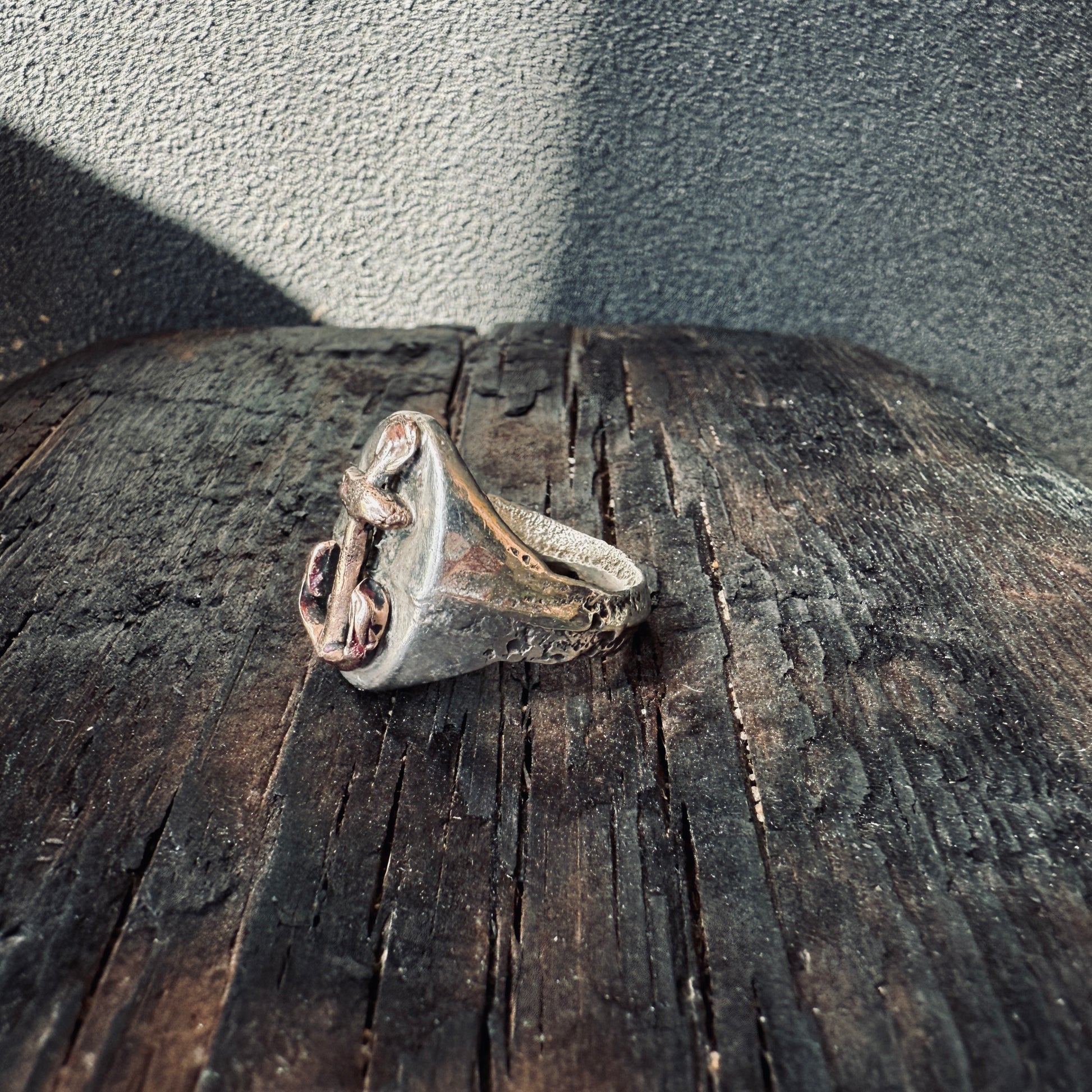 This piece was made through a process of sand-casting, where molten metal is poured into a fine sand mold capturing organic textures and unique details in the final piece. I have added a 9kgold Victorian charm in the shape of an anchor.