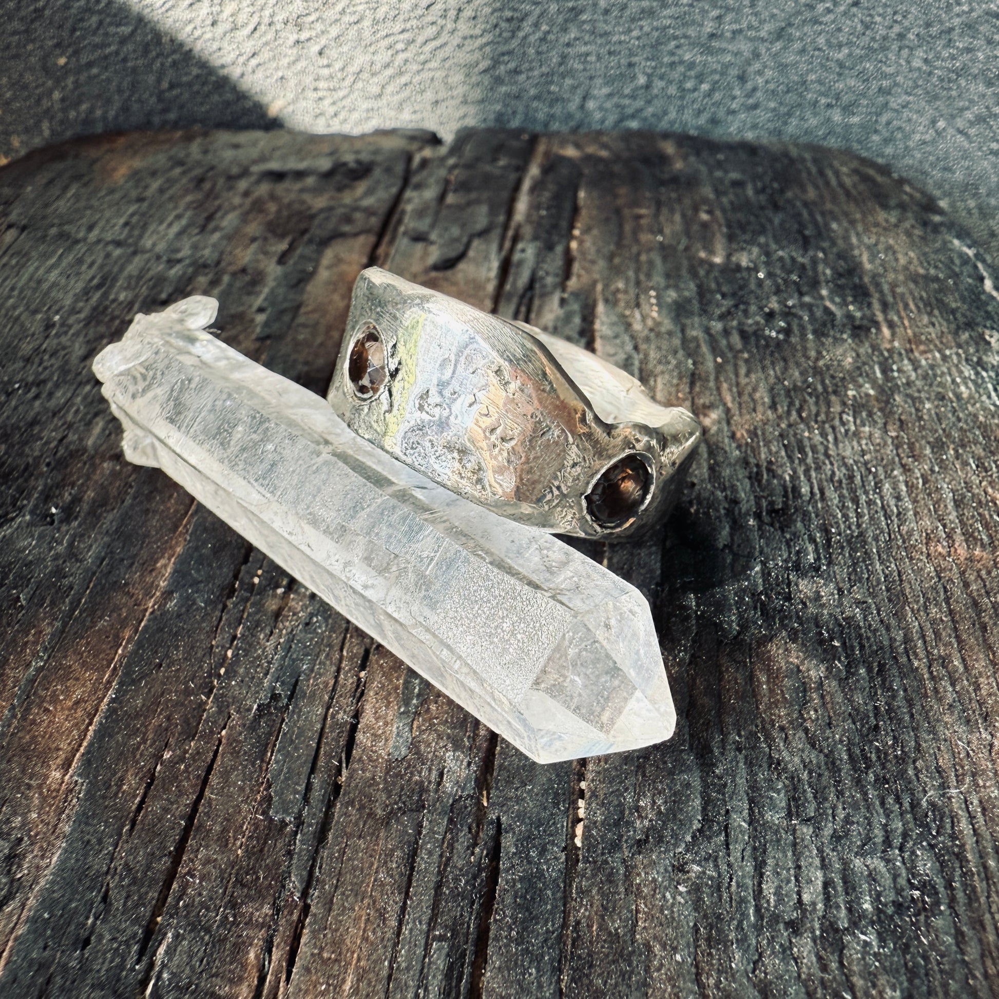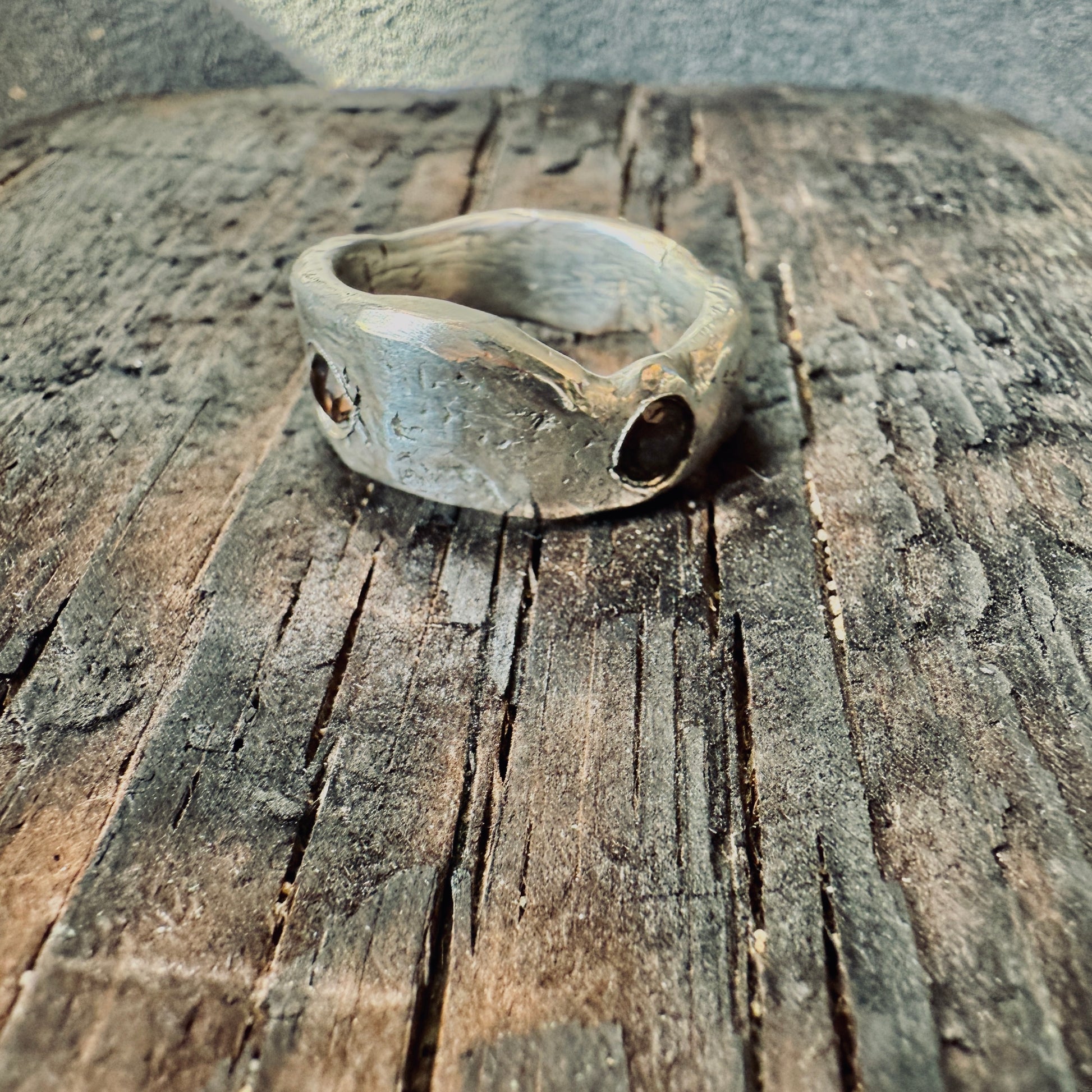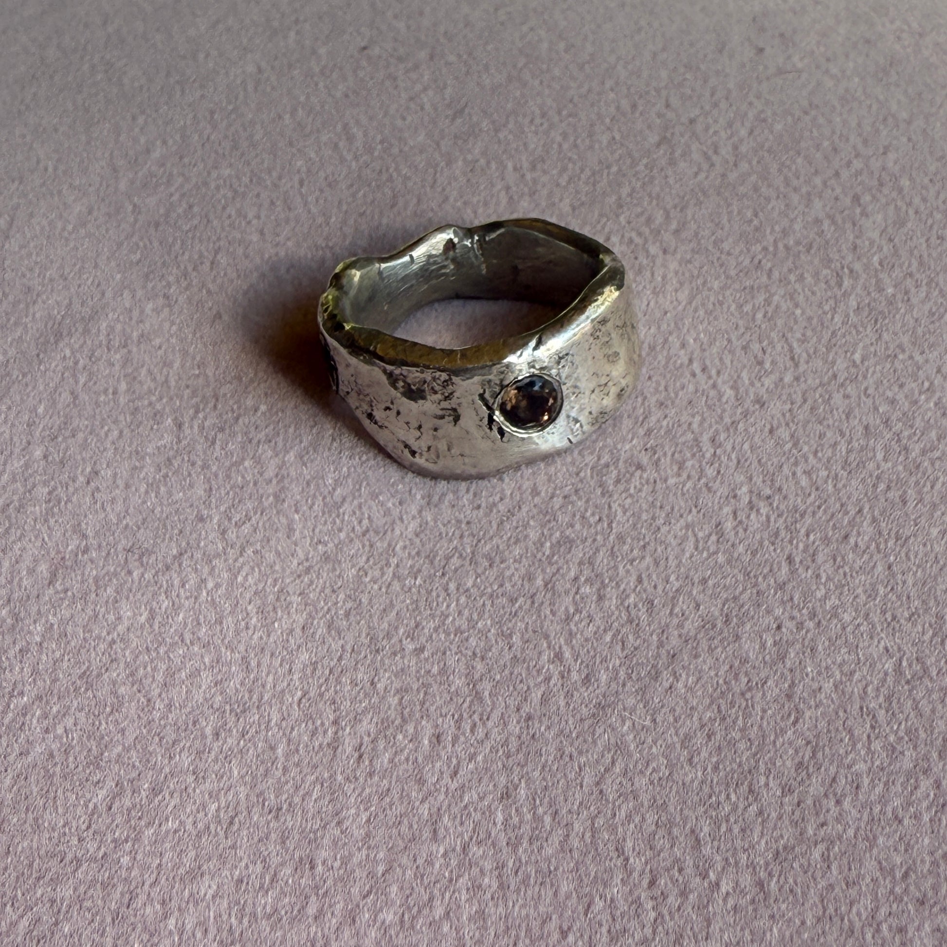 This raw silver band is totally unique. It is hand forged, patina-ed from egg oxidisation and lightly polished, and looks great stacked with other rings or just by itself. It has two smoky quartz imbedded.