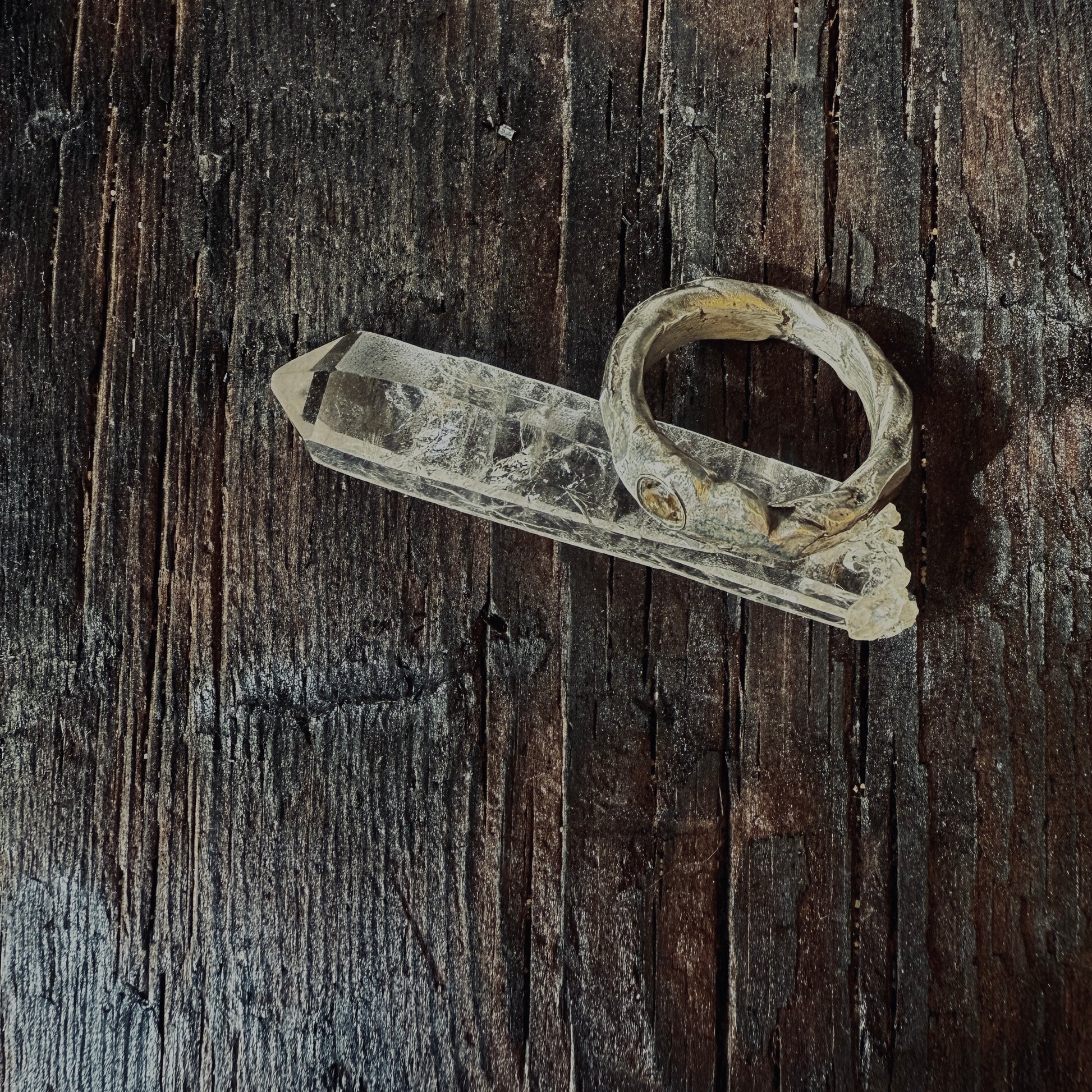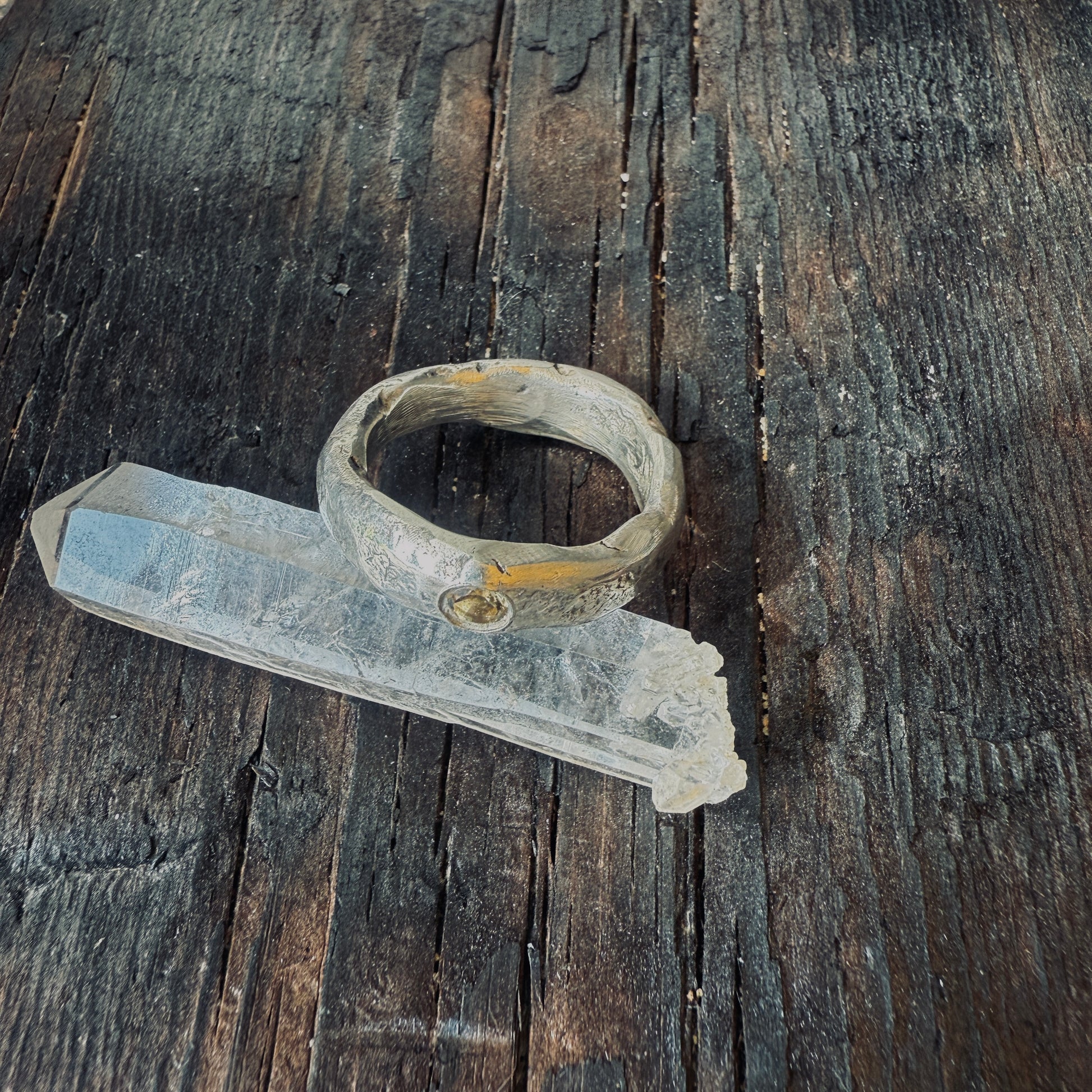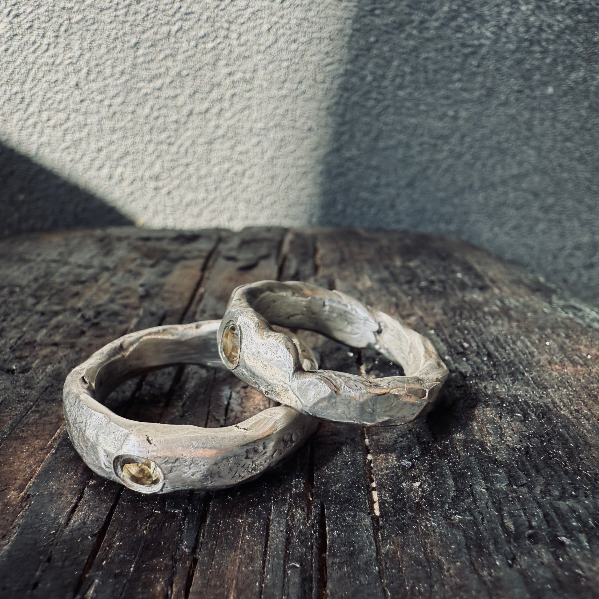 These two raw silver bands are totally unique. Each is hand forged, patina-ed from egg oxidisation and lightly polished. These looked great stacked or just by themselves. Both have a smokey quartz - These crystals get their wispy hints of brown from exposure to natural underground radiation from granite deposit and are wonderfully grounding stones.