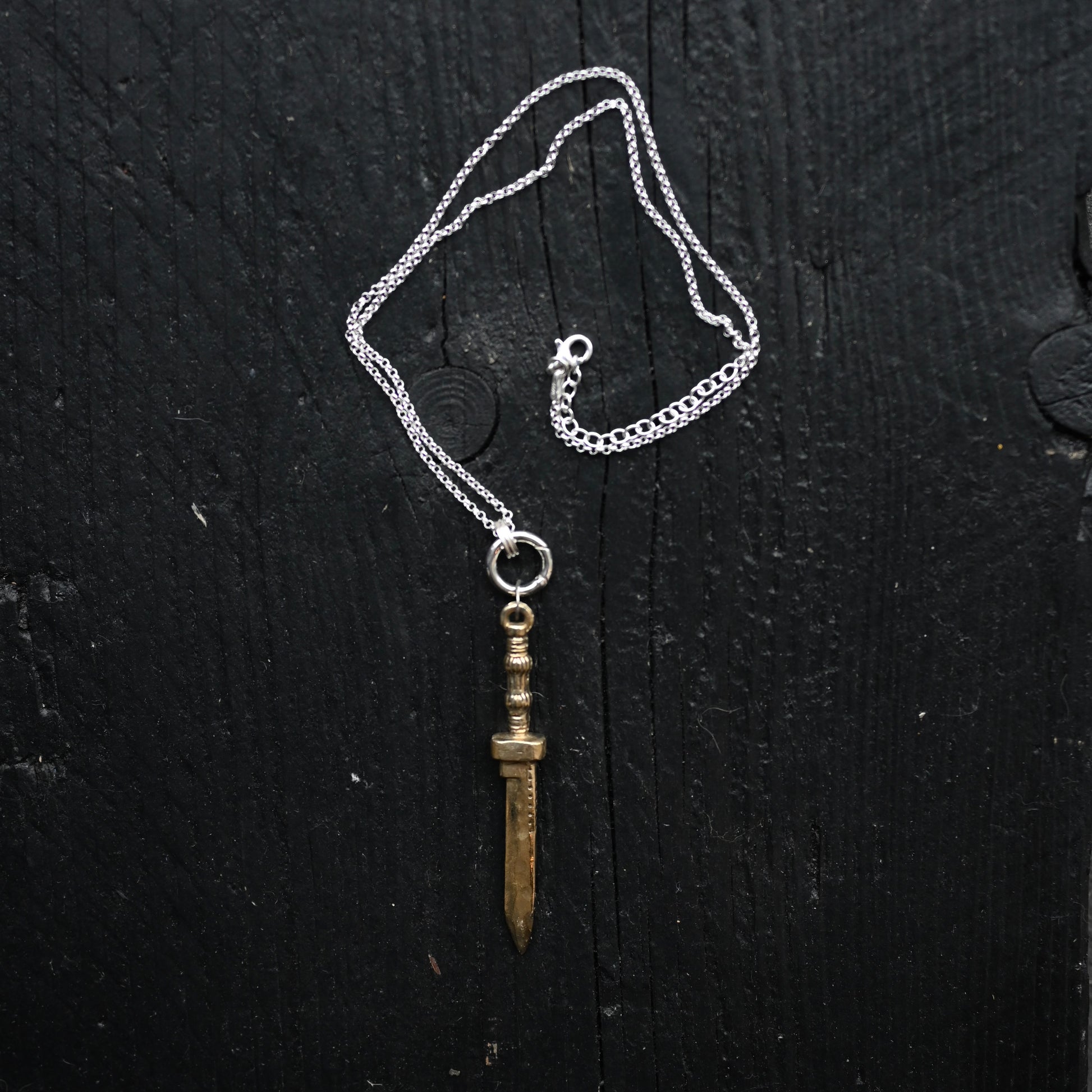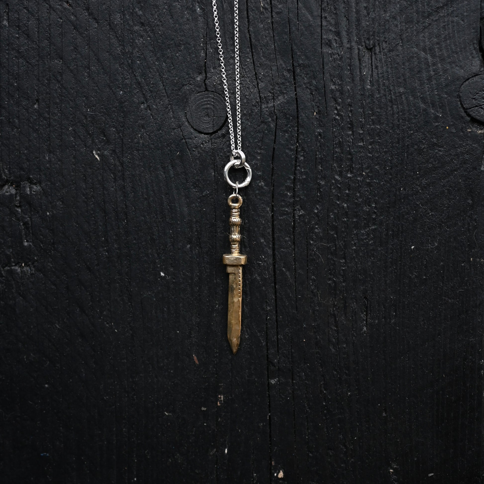 A dagger, first carved in wood, sanded, then cast in bronze, swinging off a thin silver chain. A great everyday talisman, empowering the wearer to face challenges with resilience and courage.