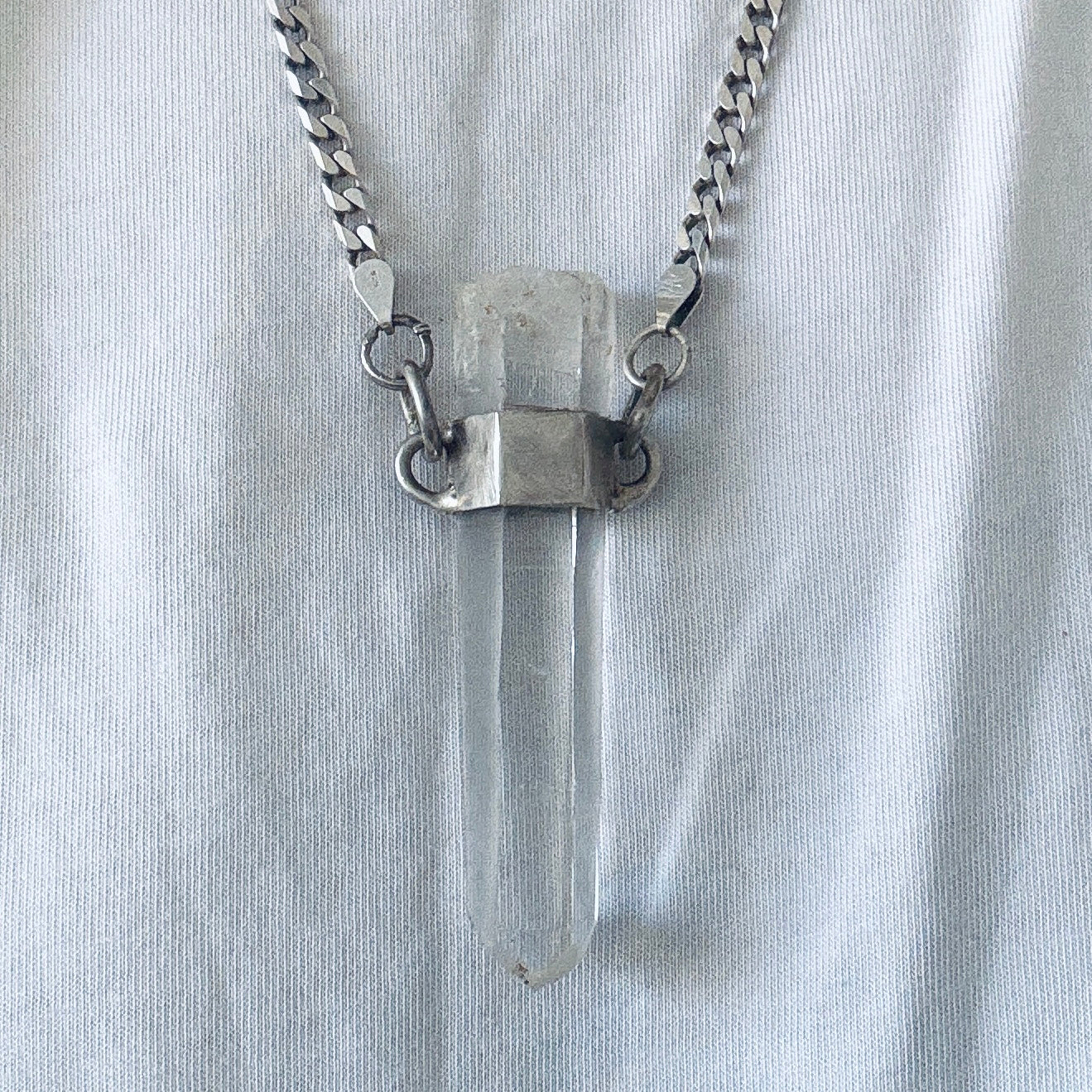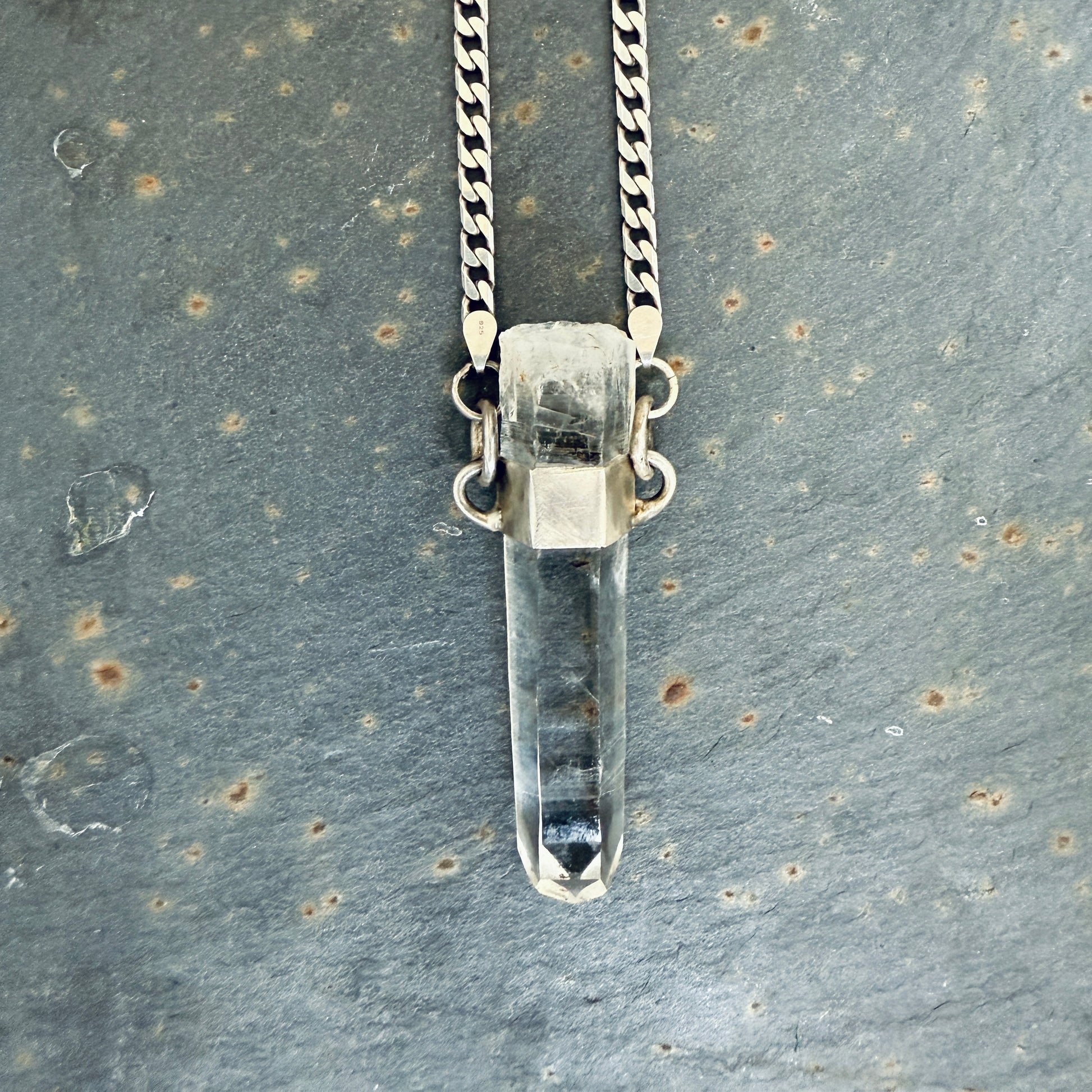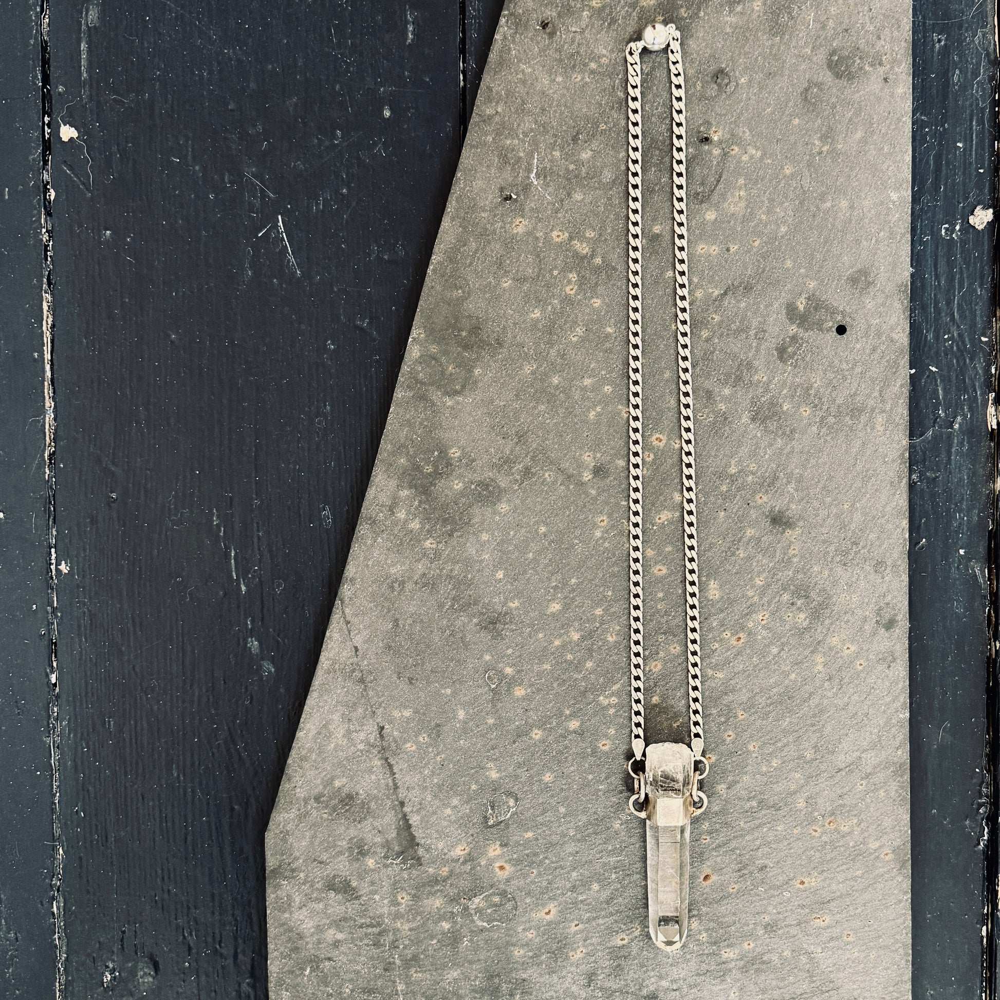 A luminous, transparent quartz that seems to glow from within, suspended on a vintage flat curb sterling silver chain with a magnetic clasp.