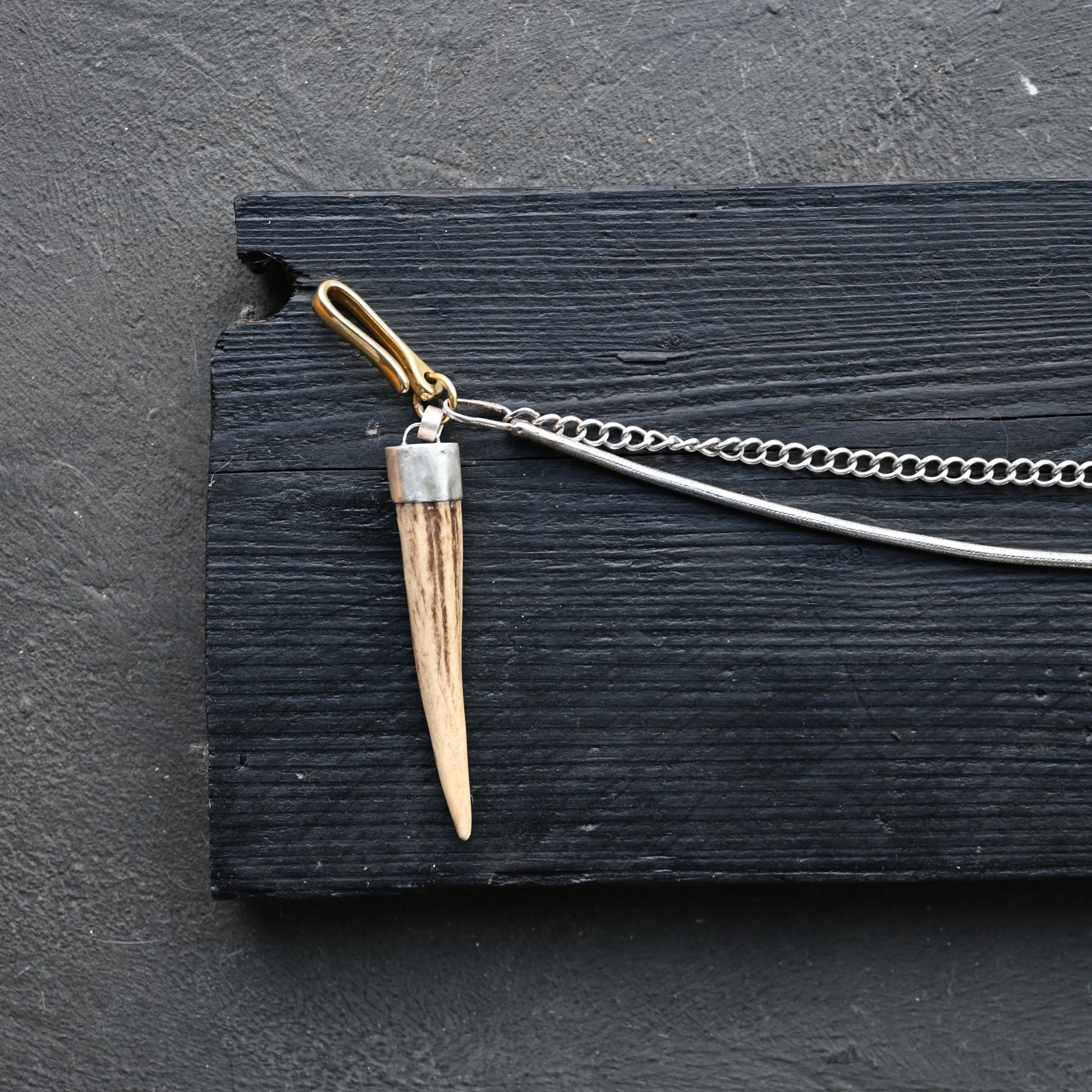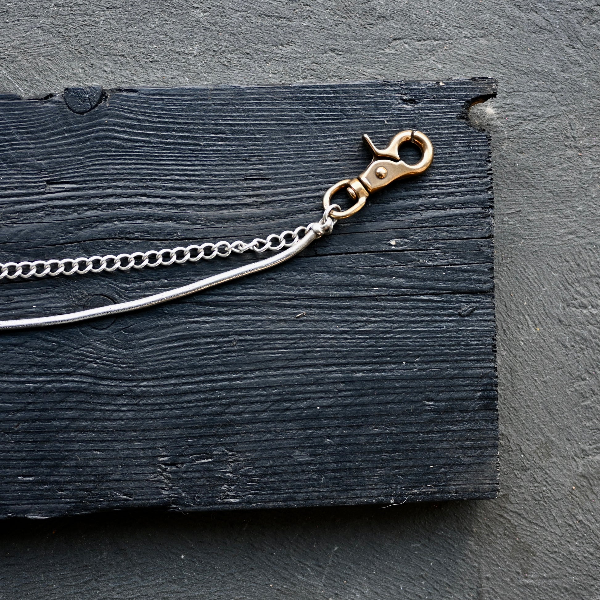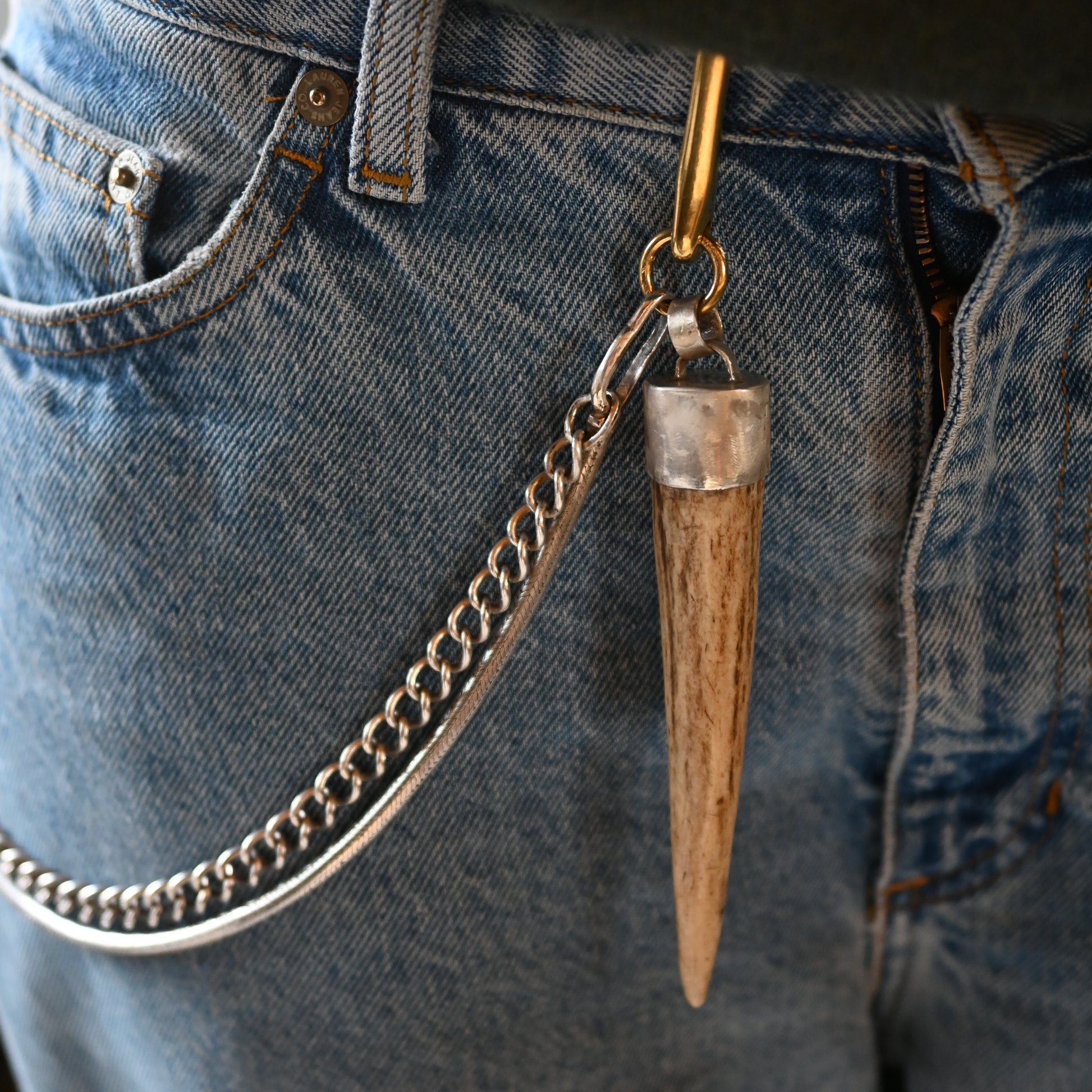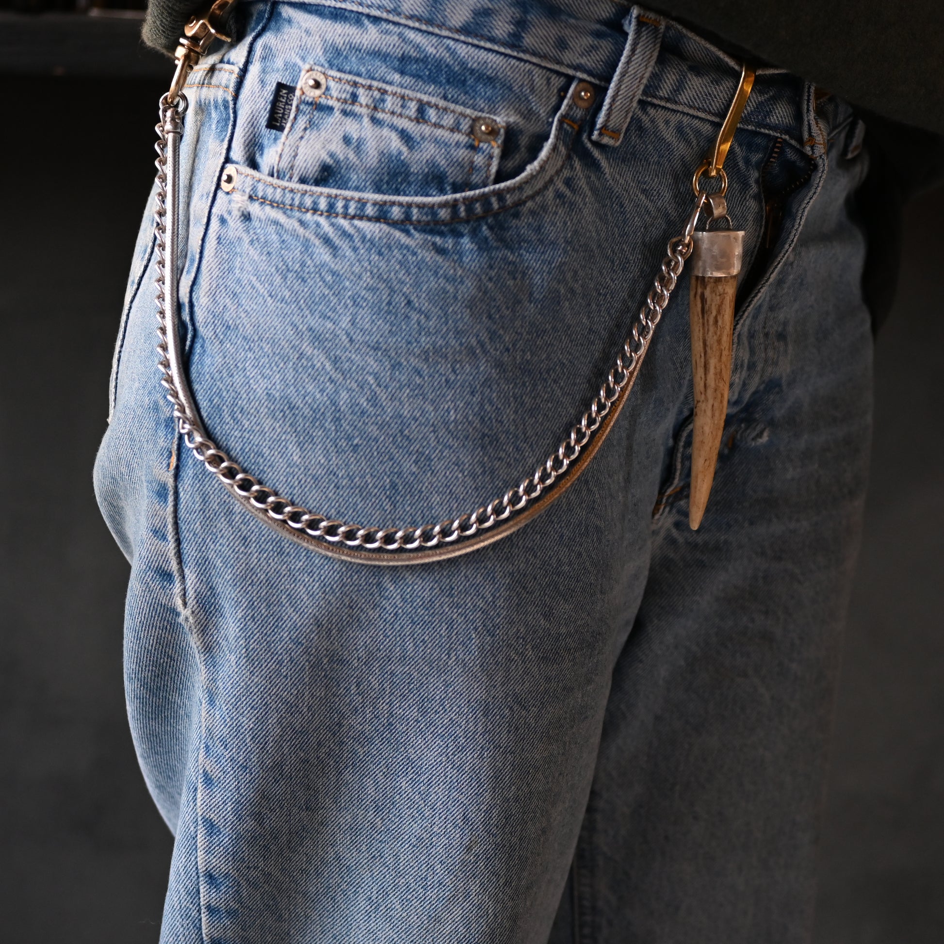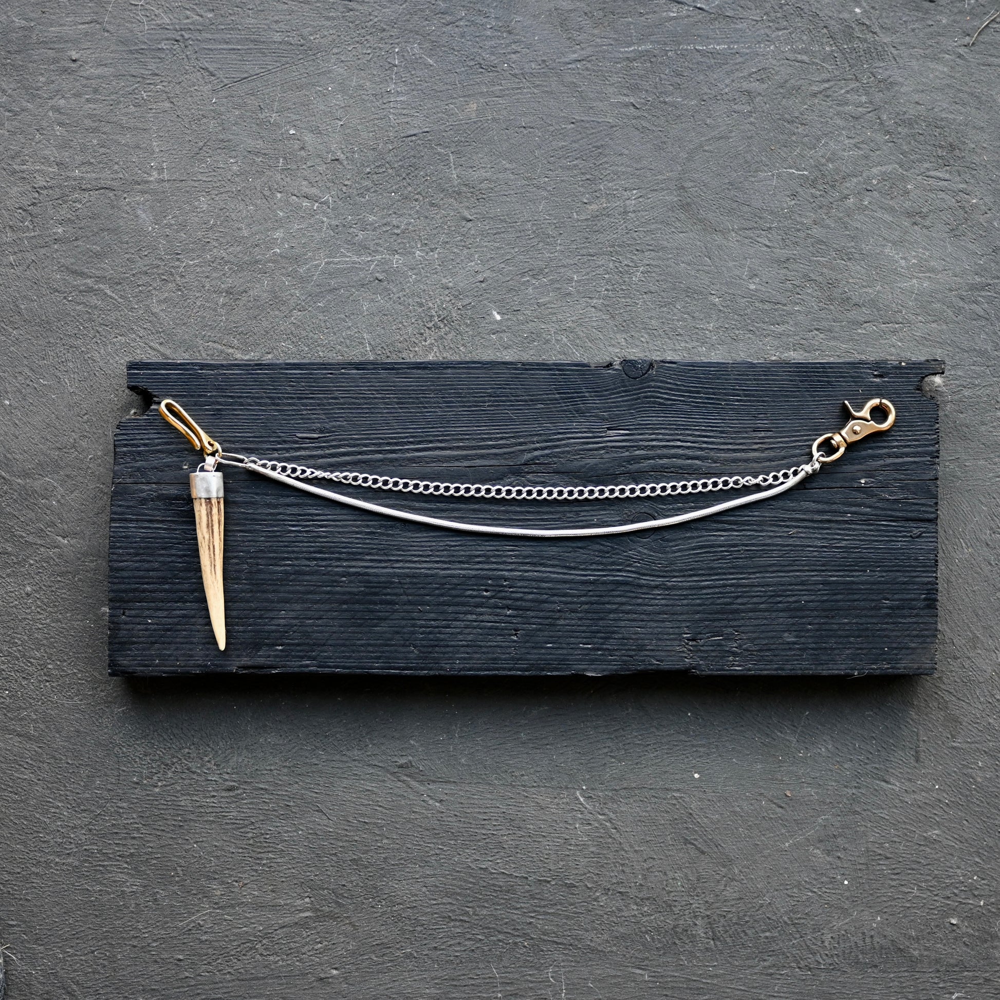 A very very unique sterling silver strap. One end clips onto your belt or trousers hoop, and the other to wallet or keys or... Traditionally I make these in leather, but I thought I would make a really special one in hefty silver. One chain is an antique and the other is a vintage snake chain from the 1980s, with italian brass fixings on either end. I paired this with an antler amulet - foraged (naturally fallen off) and capped in sterling silver. I cannot descriobe how epic this looks - there is a lot of silver on this!
