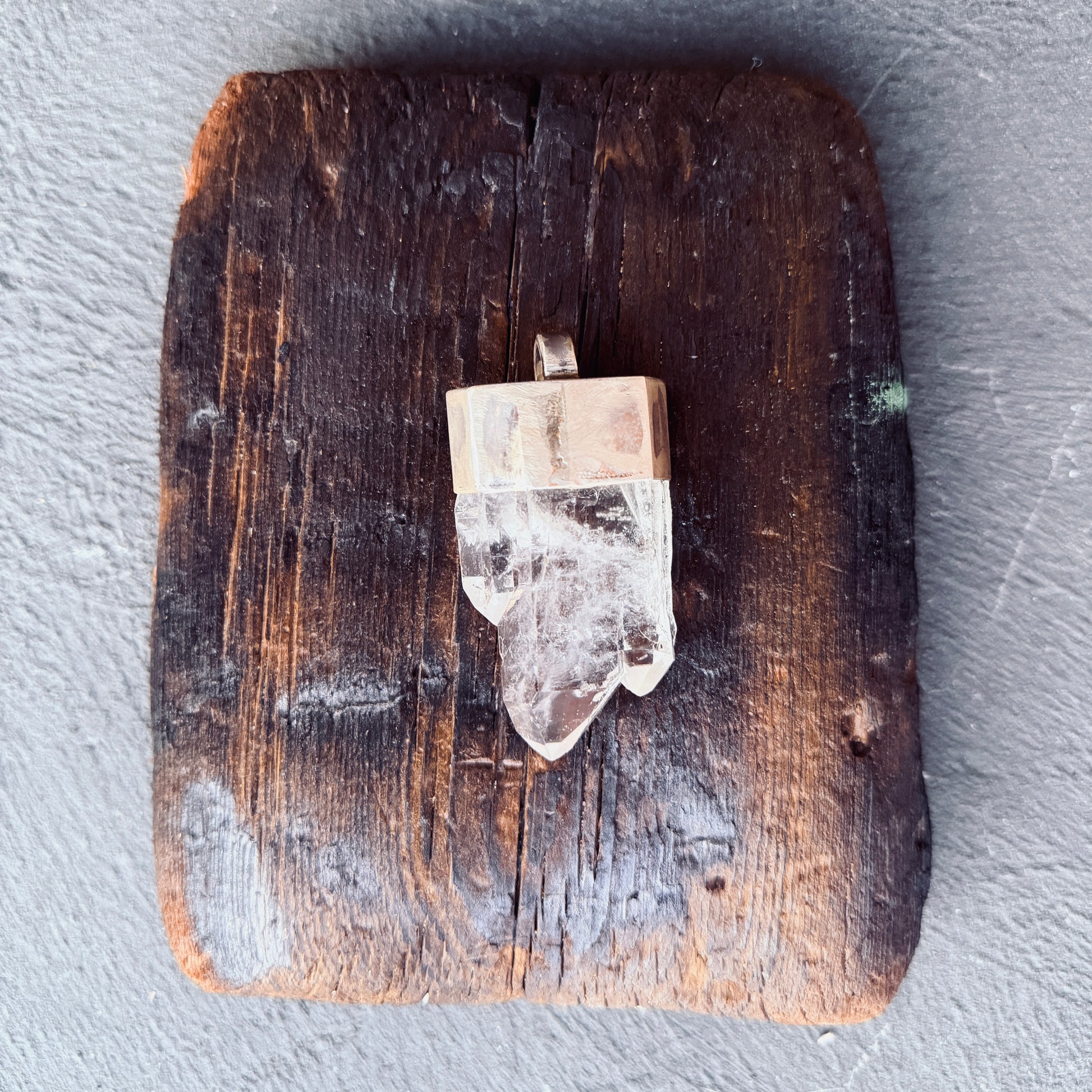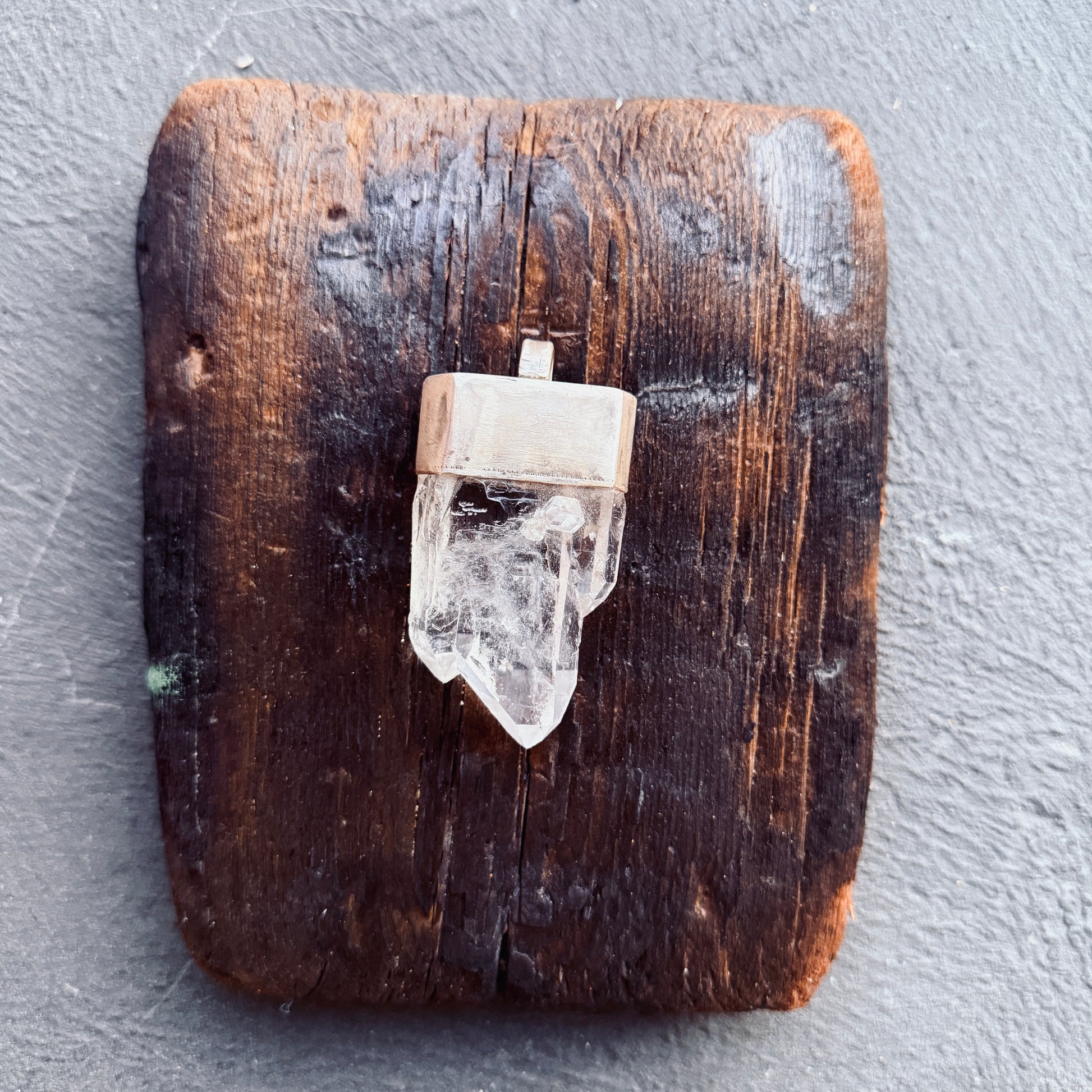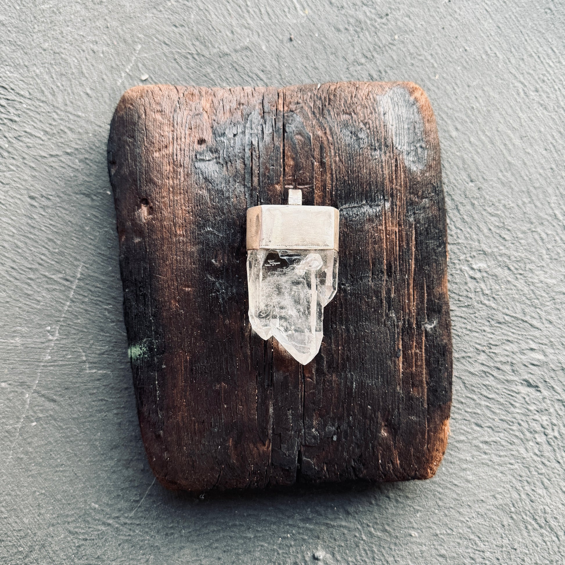Shaped as a grand tabular crystal, it rests naturally flat on the chest. The piece is capped in sterling silver and suspended from a hammered, oxidized astral torque choker of elegant simplicity. The pendant combines 15 grams of silver with 67 grams of quartz. Suitable for daily wear, it also serves as a potent companion in ritual or meditation.